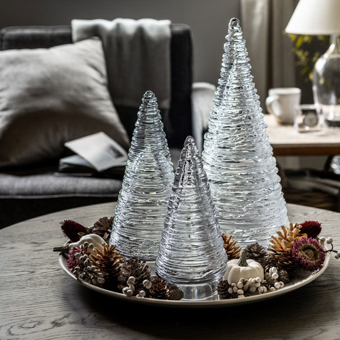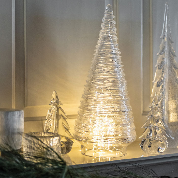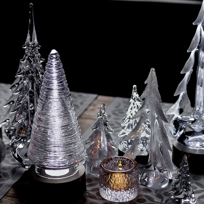 A uniquely textural and entirely new addition to our lineup of handcrafted glass trees. Each Echo Lake Evergreen is formed by master glassblowers nimbly wrapping fine strands of glass around a conical center. The ECHO LAKE EVERGREEN is available in several tree heights.