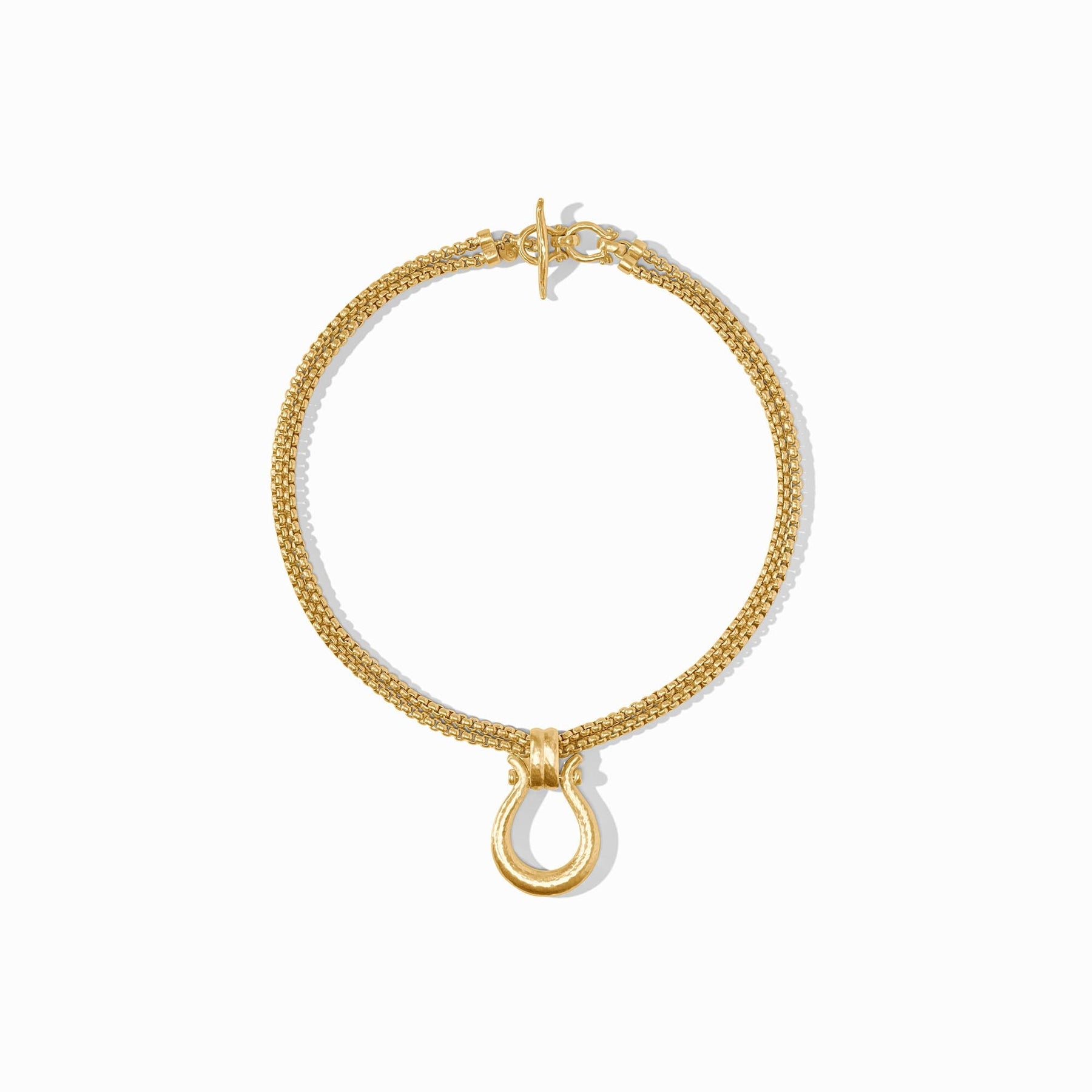 It's off to the races in this necklace's lightly hammered golden bridle ring pendant, which sways from a doubled Venetian box chain that closes with a yoke-shaped toggle.
