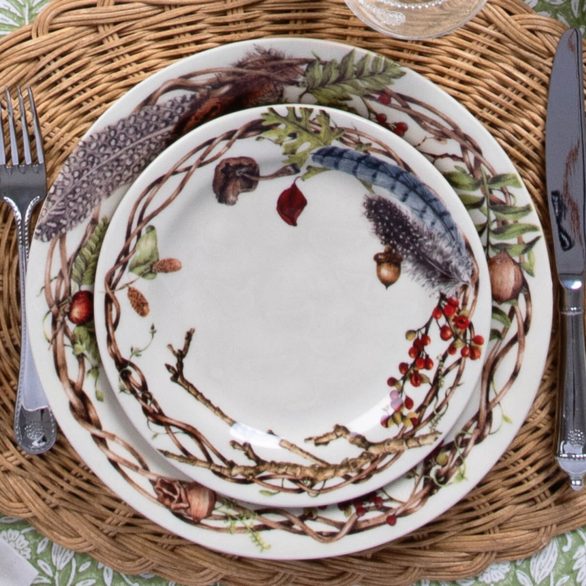 From our Forest Walk Collection- Found treasures from woodland rambles are artfully arranged in a coronet of wildly beautiful things. Our 16 piece setting in contains 4 dinner plates, 4 party plates, 4 berry bowls, and 4 mugs.