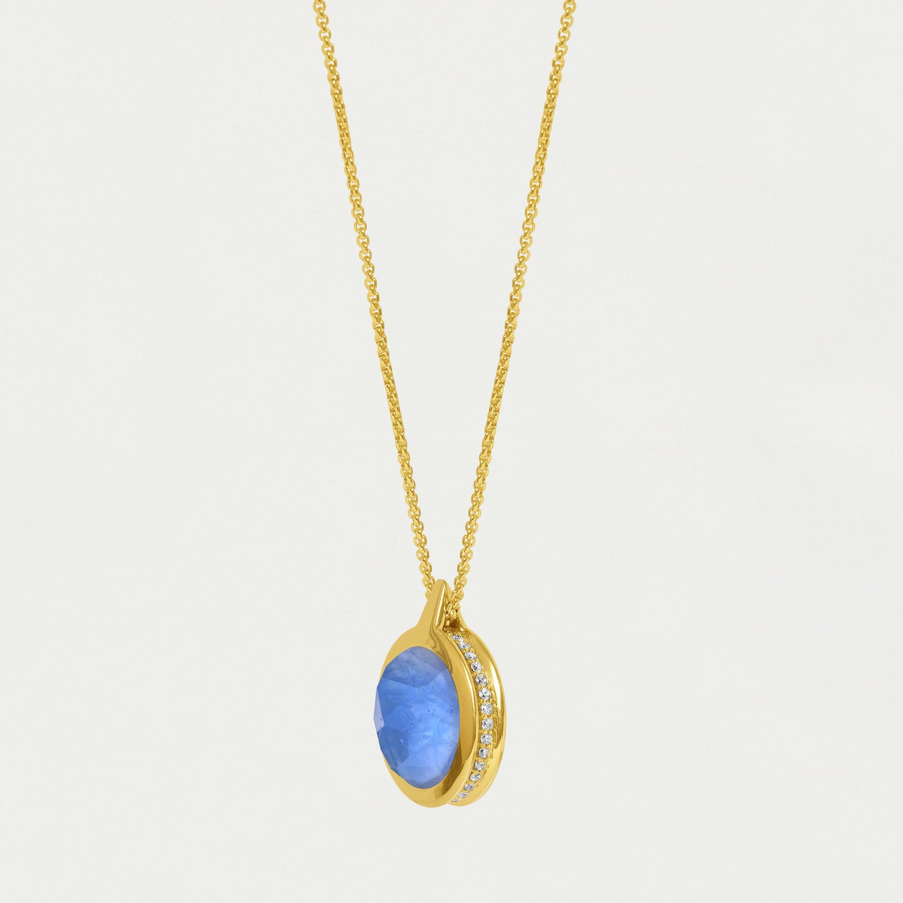 Imbued with endless styling potential, this double-sided pendant features faceted Rainbow Moonstone and Midnight Blue gemstones with Pavé detailing. A statement on its own, this piece also plays well with other stackable chains.