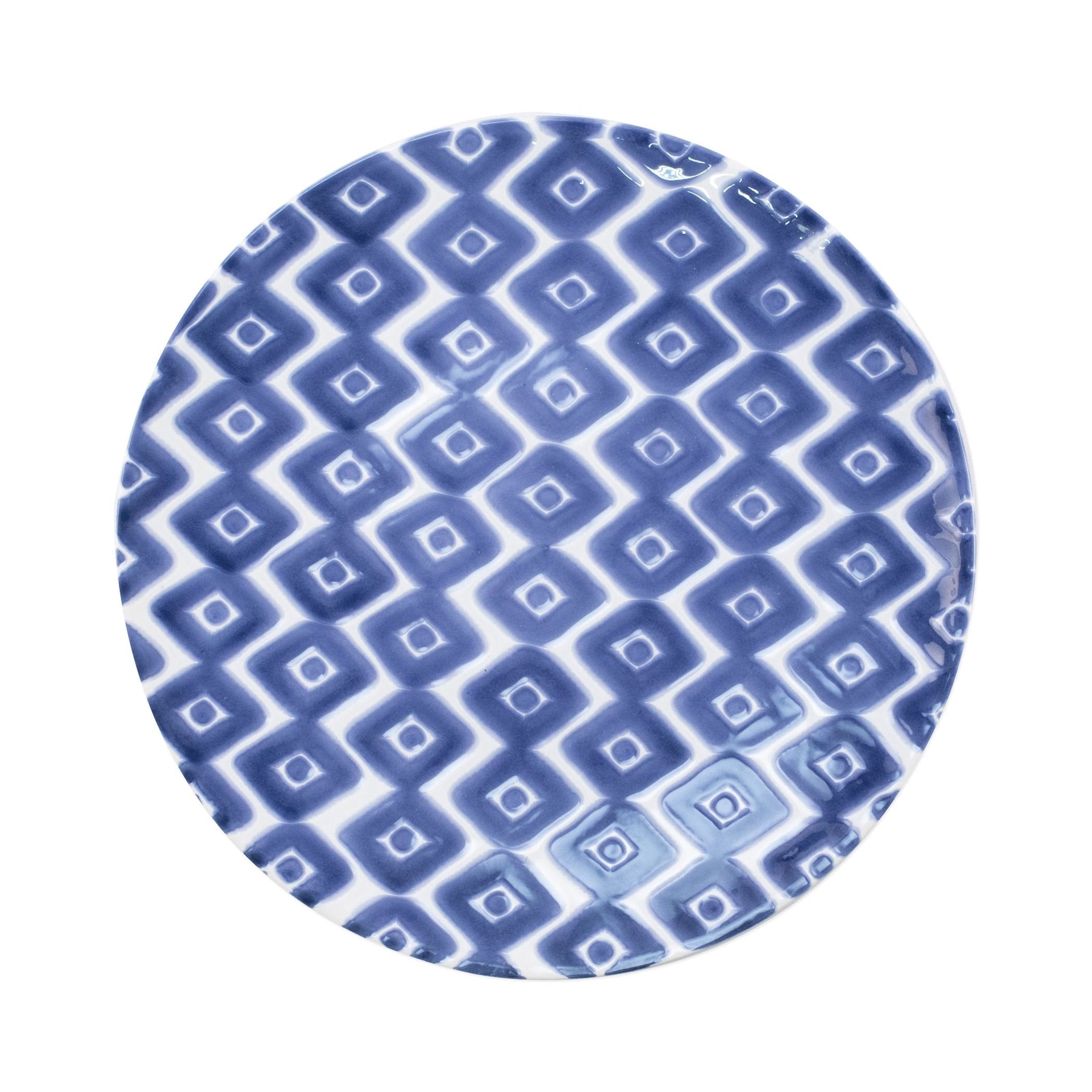 Recreate the beautiful mosaic tiles found in the Greek Isles with the Santorini Diamond Dinner Plate, painted on hard ceramic in a fun blue and white pattern.