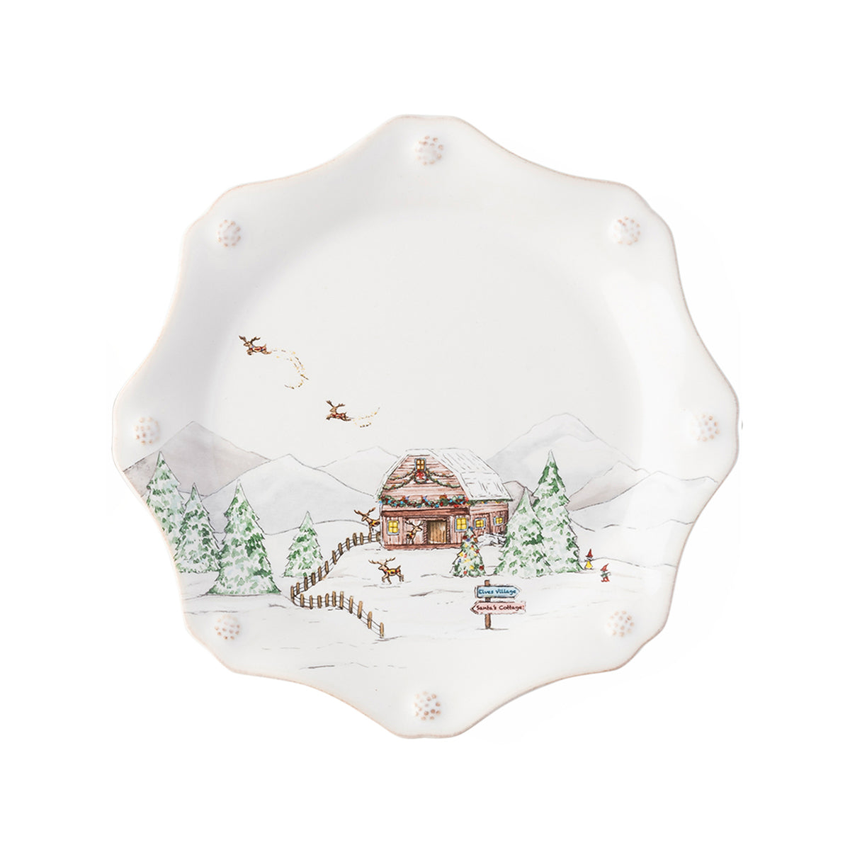 The mythical, folkloric world of the North Pole is hand illustrated atop iconic Berry & Thread shapes in this new holiday collection. Each scalloped dessert/salad plate in this set of four features a unique scene – the reindeer barn, Santa's cottage, the elves' village and toy workshop!