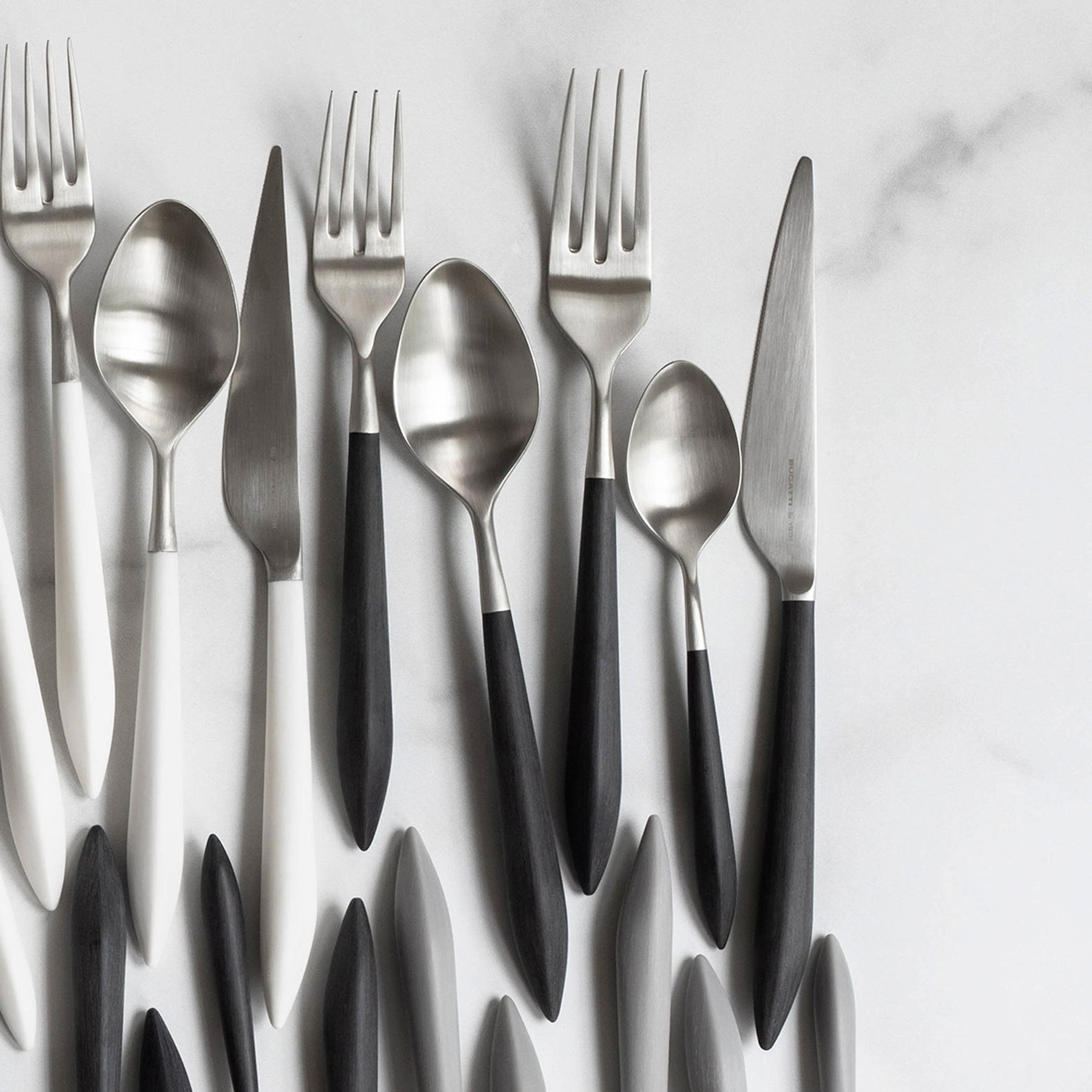 The contemporary matte handle found on the Ares Argento & Black Five-Piece Place Setting provides perfect balance and weight for a luxury flatware experience. Argento, the brushed silver, finishes off the utensil in 18/10 stainless steel.
