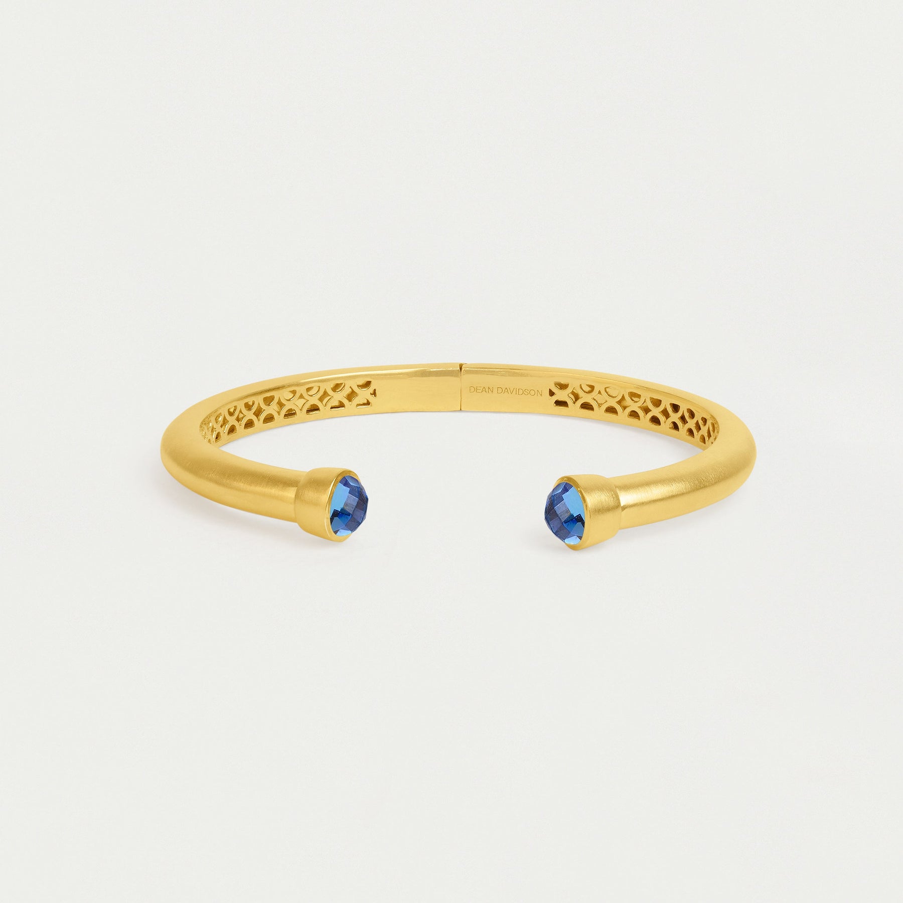 Double the impact with two hand-faceted gemstones, each punctuating the end of a brushed-gold open cuff. Featuring a hidden hinge and lightweight feel, it’s easy to pop on and keep on all day and night.