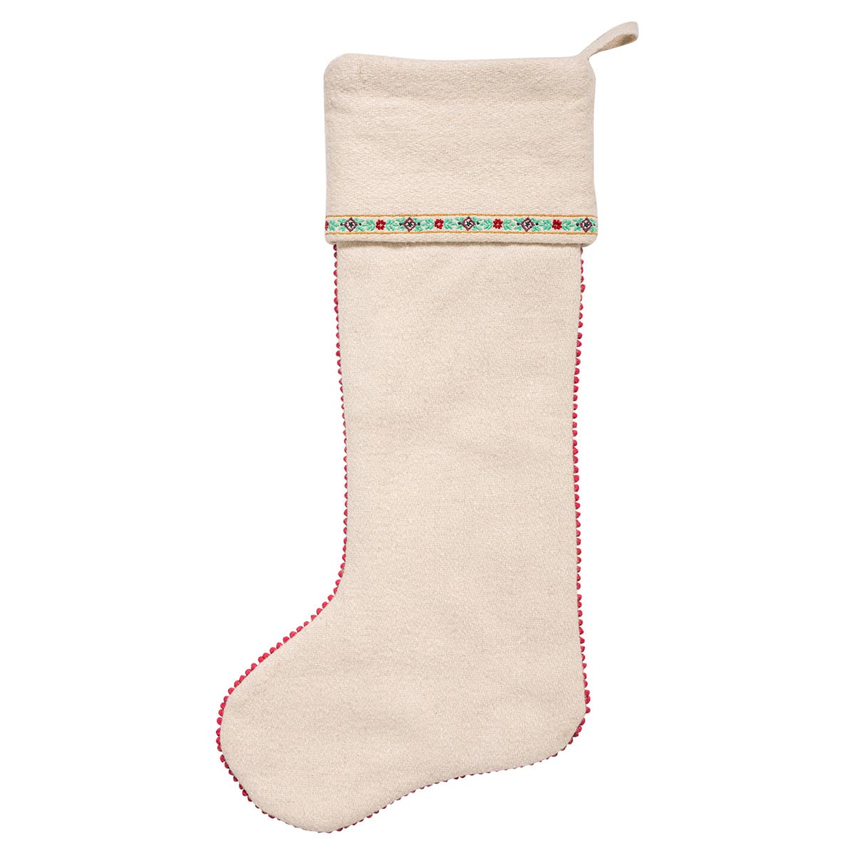 A folkloric motif from the Austrian alps is intricately embroidered in a trellis pattern of cascading snowflakes to bring beautiful texture in cheerful traditional colors to your mantle. Pair this vibrant stocking with our Heidi embroidered pillows to create a cohesive look that sets a joyful scene for the holiday season -- whether you’re fireside après-ski or sipping tipples while trimming the tree.