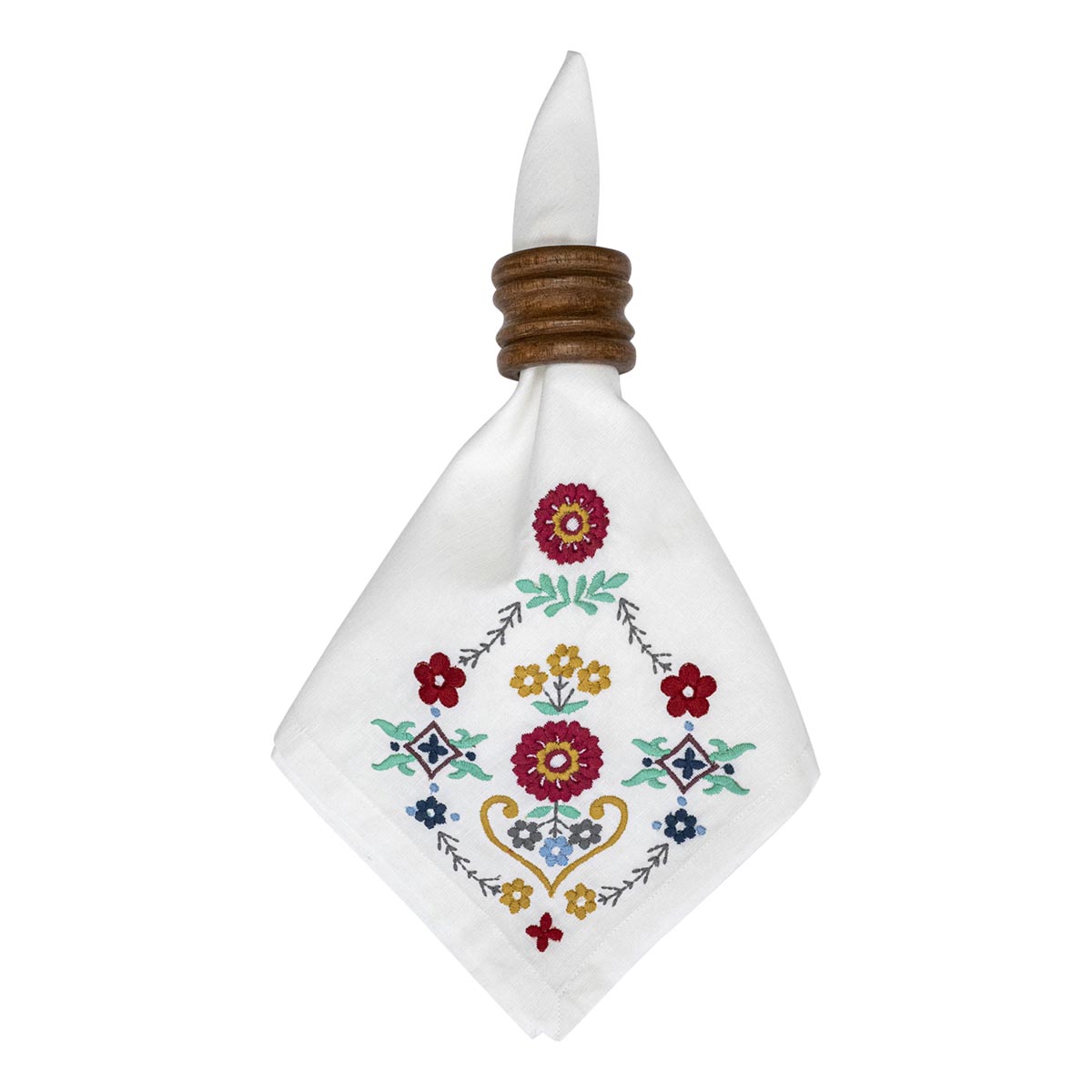 Evocative of inherited heirlooms, these woven linen napkins feature subtly stunning embroidery at the corner (perfect placement for styling within napkin rings) in an intricate floral motif that adds instant easy elegance to any table. The crisp white canvass with brilliant pops of colors works beautifully year-round, from candy cane and evergreen inspired holiday tablescapes to spring and summer splendor in all their blooming hues.