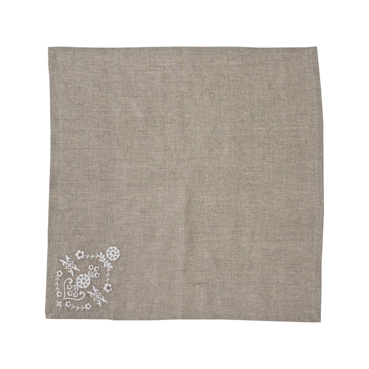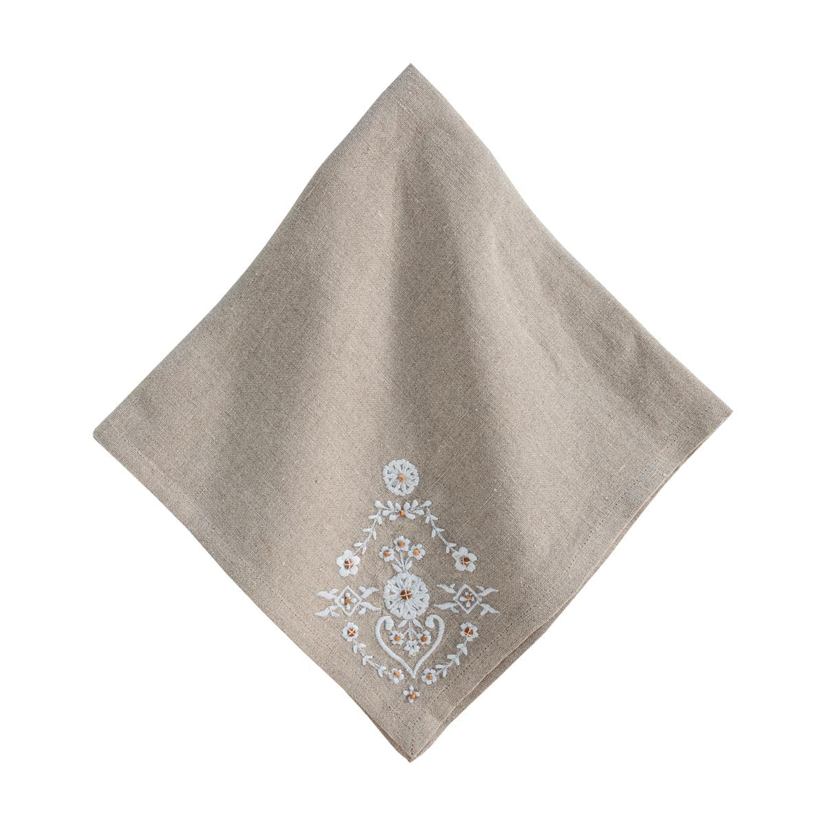 Evocative of inherited heirlooms, these linen napkins of woven cotton feature subtly stunning embroidery at the corner (perfect placement for styling within napkin rings) in an intricate floral motif that adds instant easy elegance to any table. The neutral flax canvass with cream details works beautifully year-round, from holiday tablescapes to weekend suppers.