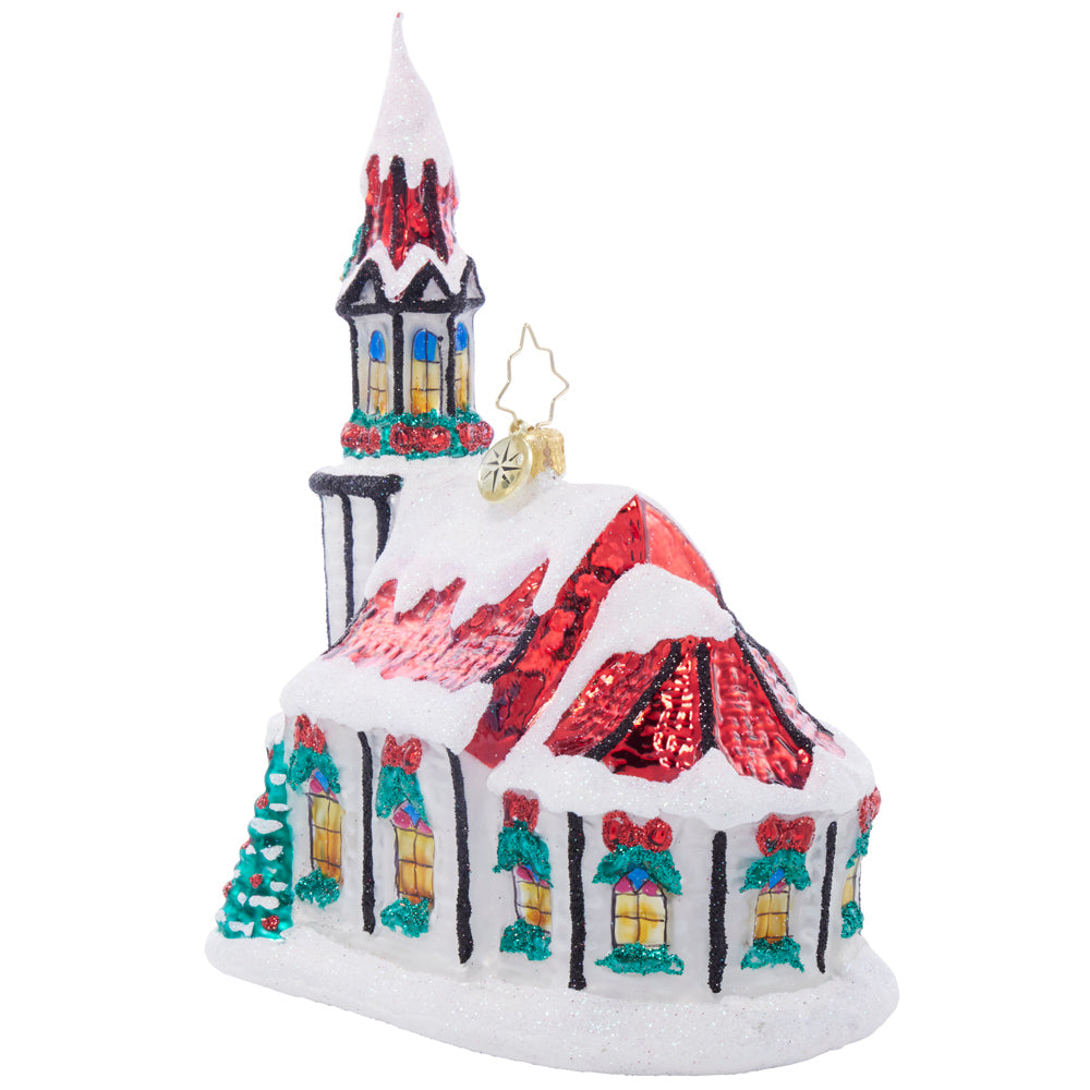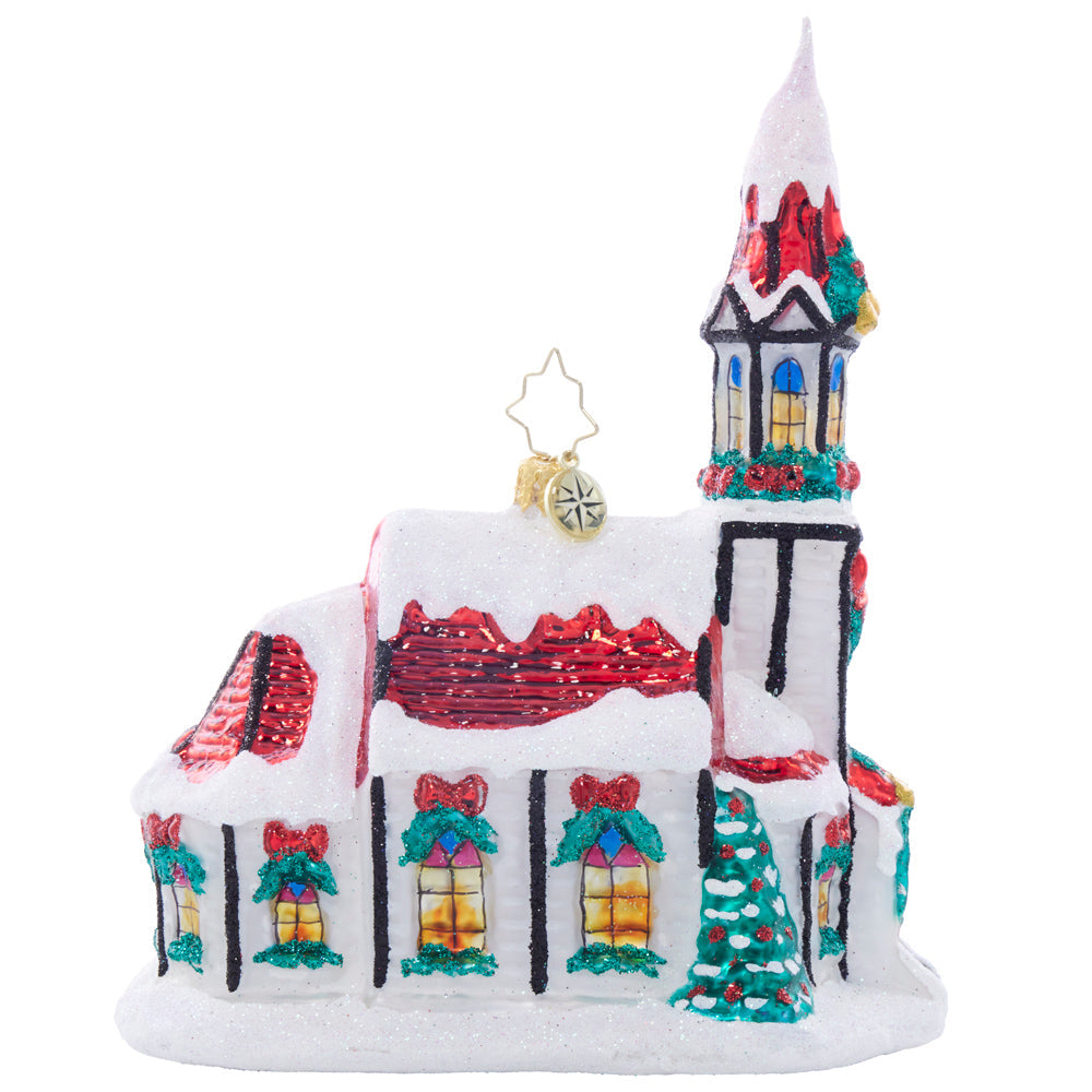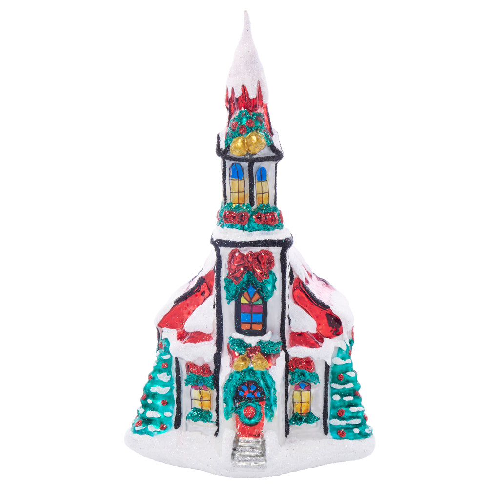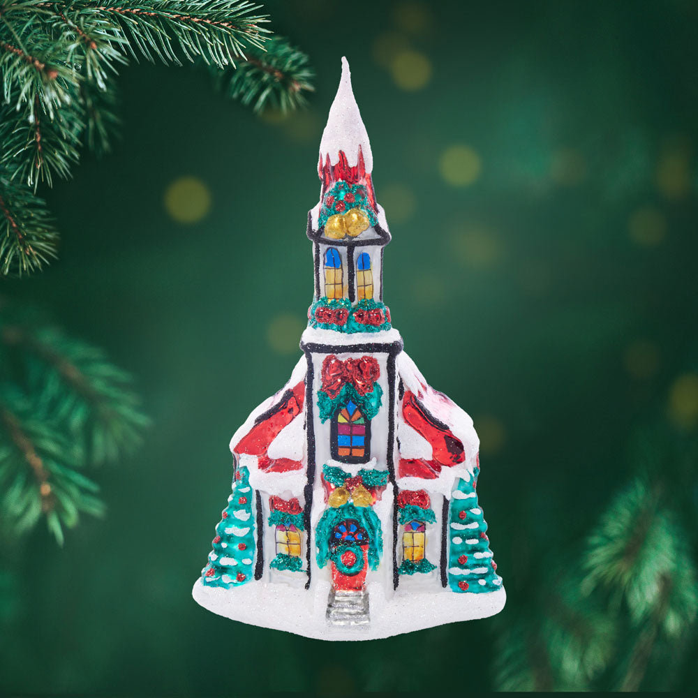 A tiny chapel nestled among the branches covered in white snow, complete with festive bells that chime with the joyous spirit of the season. Adorn your tree with this cherished keepsake.