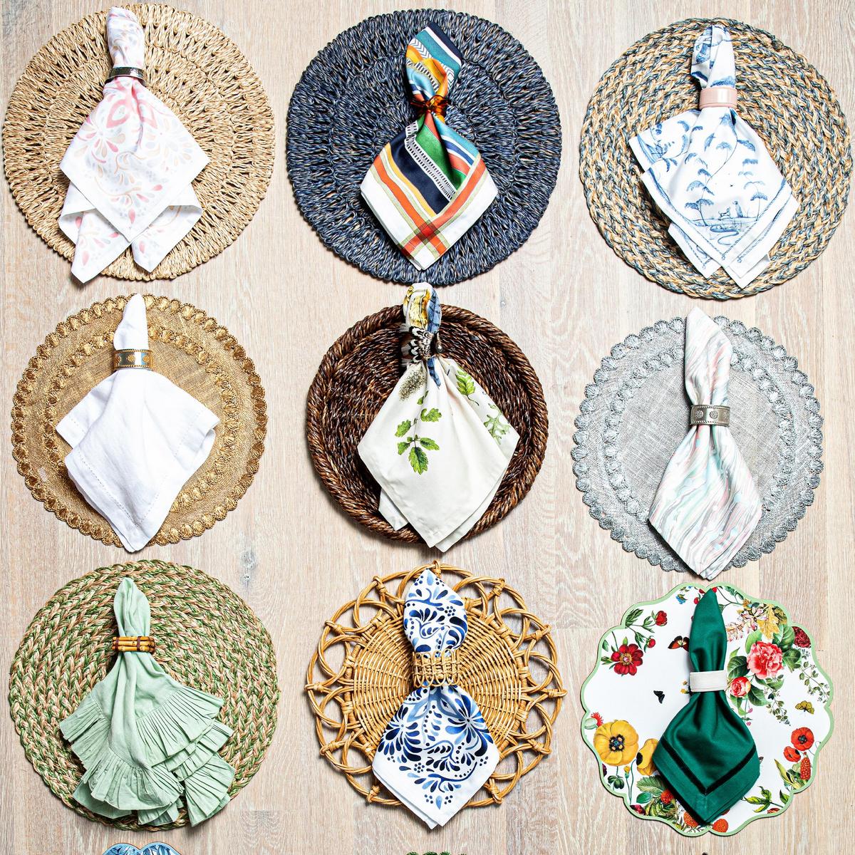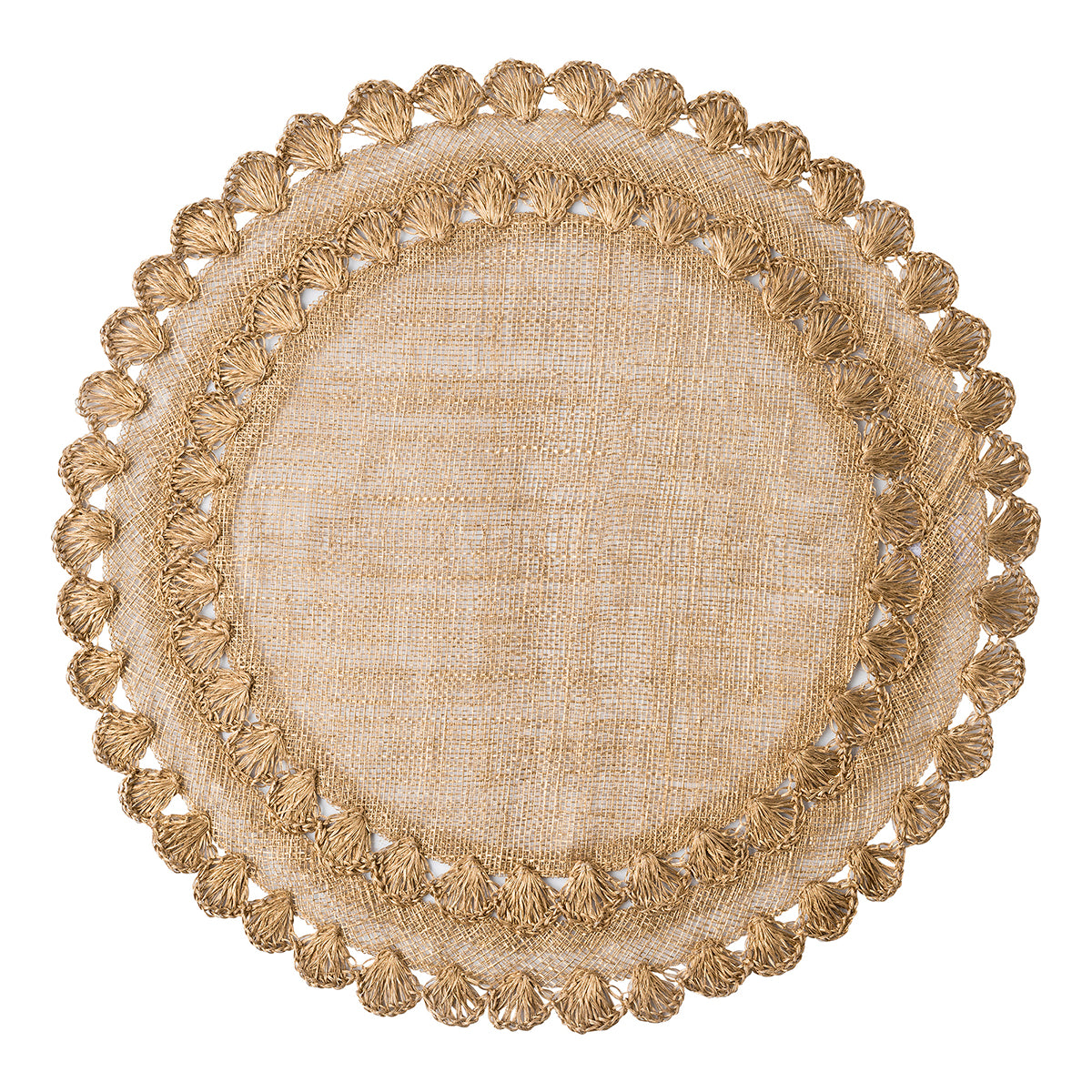 Natural woven fibers and texture are veiled in luminous gold and embellished by a ruffled rim to create a frame for table settings that is both relaxed and elegant.