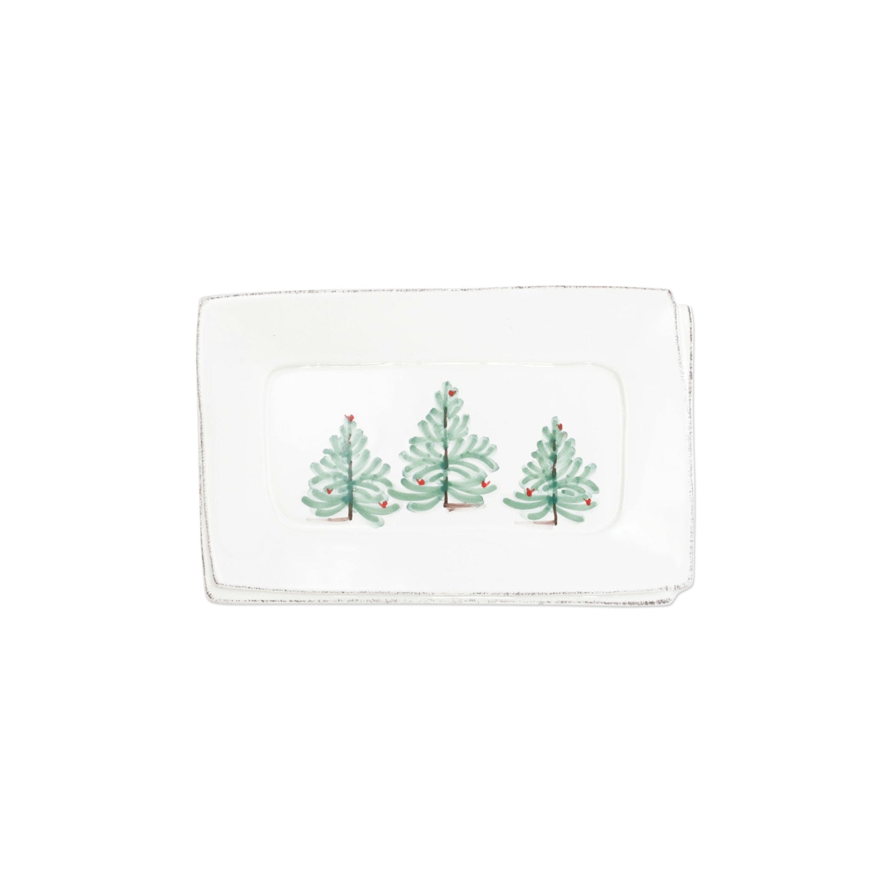 Delight in the holiday magic as handpainted fir trees and bright cardinals drift across the fresh white canvas of the Lastra Holiday Small Rectangular Tray. Mix and match with Lastra for a fun and sophisticated holiday table with a twist!