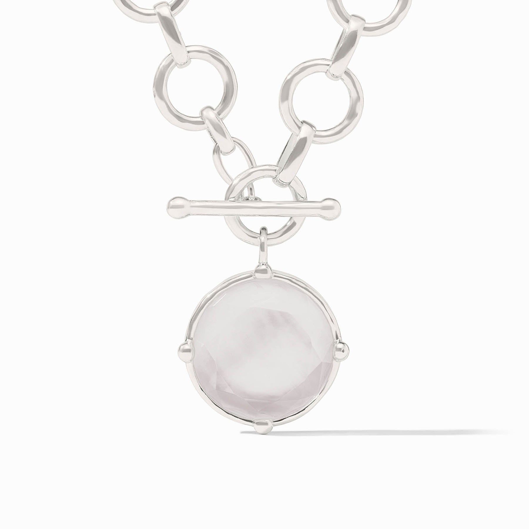 Lustrous, lightly hammered links lead to a round precision-cut statement gemstone embellished with a cameo bee on the reverse side.