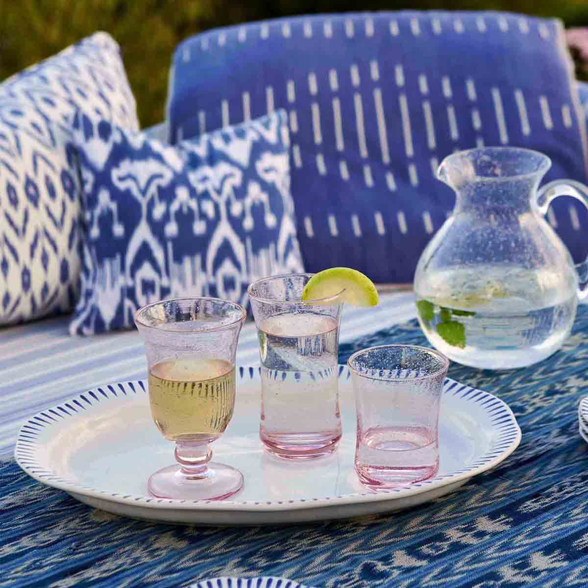 Inspired by the traditional bubbly glassware from Provence and of sturdy construction to make everyday drinking, effervescent. From morning smoothies to sunset cocktails (or mocktails) this mouth-blown tumbler brings a charming spirit of joie de vivre to every sip. Offered in four chic and versatile hues: Basil, Chambray, Blush, and Clear (we always love to add a pop of color to the table with colorful glass)!