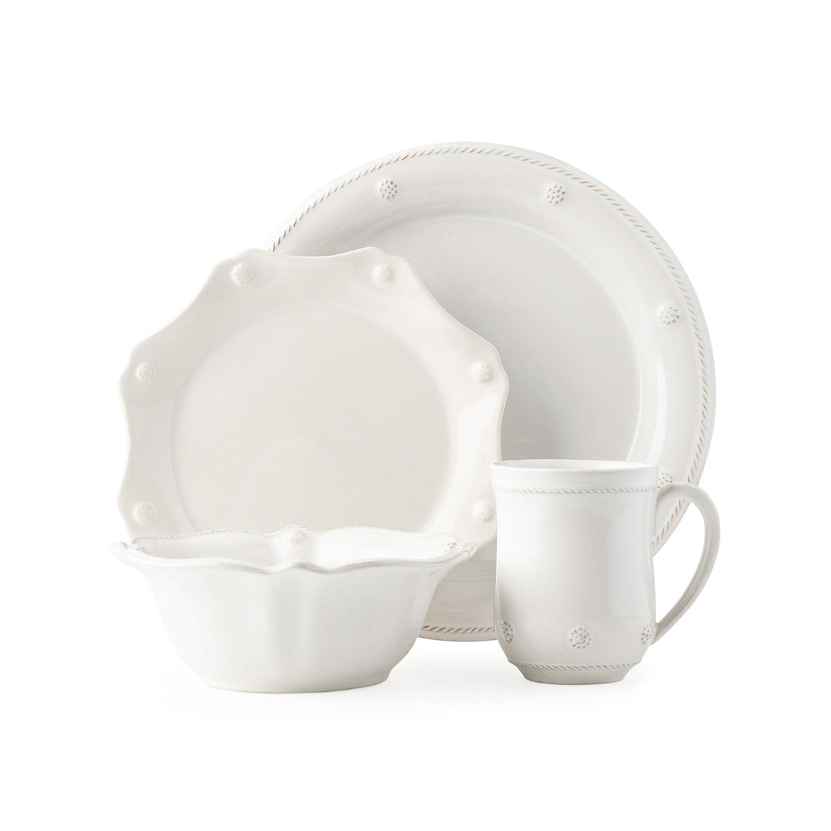 Rimmed with our simple thread and adorned with a sprinkling of berries, our new 4 piece place setting in Whitewash contains a round dinner plate, scalloped dessert/salad plate, cereal/ice cream bowl and mug.