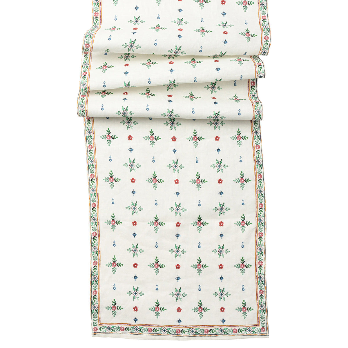 As fresh as fallen snow and as festive as an Alpine village in winter, this pure linen table runner is rich in charm and joyful in hue. A prim motif of traditional folkloric florals is framed within a painterly border in ruby, evergreen and cornflower blues to mix and match with practically everything and create a magical table setting—however casual or formal you want to style it.