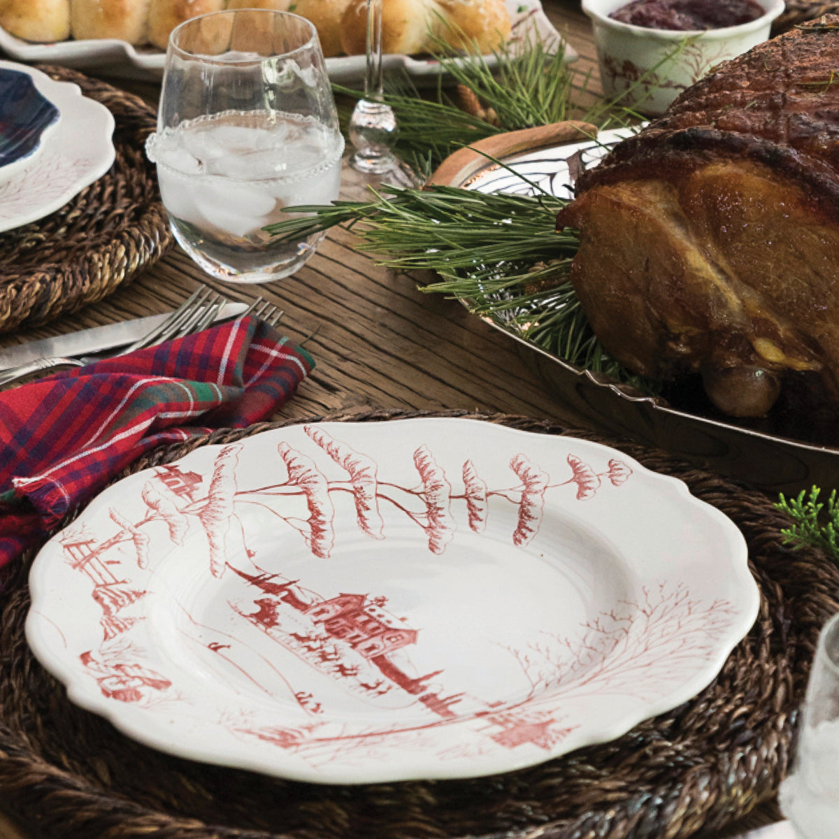 From our Country Estate Collection - All that's merry and bright sparkles from the festive ruby winter scene of our scalloped edge dinner plate. The perfect backdrop to your winter celebration, our plate mixes beautifully with our other collections.