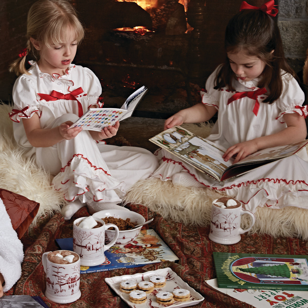 Our charming English Country Estate is snow covered for the holidays! In this latest chapter of the estate at Christmastime, Santa & Merry celebrate with all the North Pole inhabitants. This generously sized mug features illustrations of the elves ice skating on the pond outside the Boathouse, and Santa & Merry walking arm and arm through the estate.