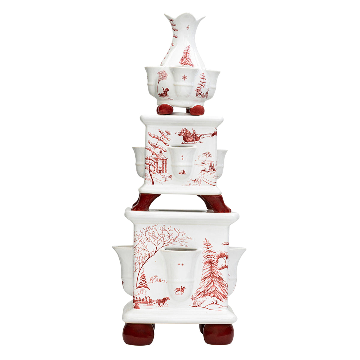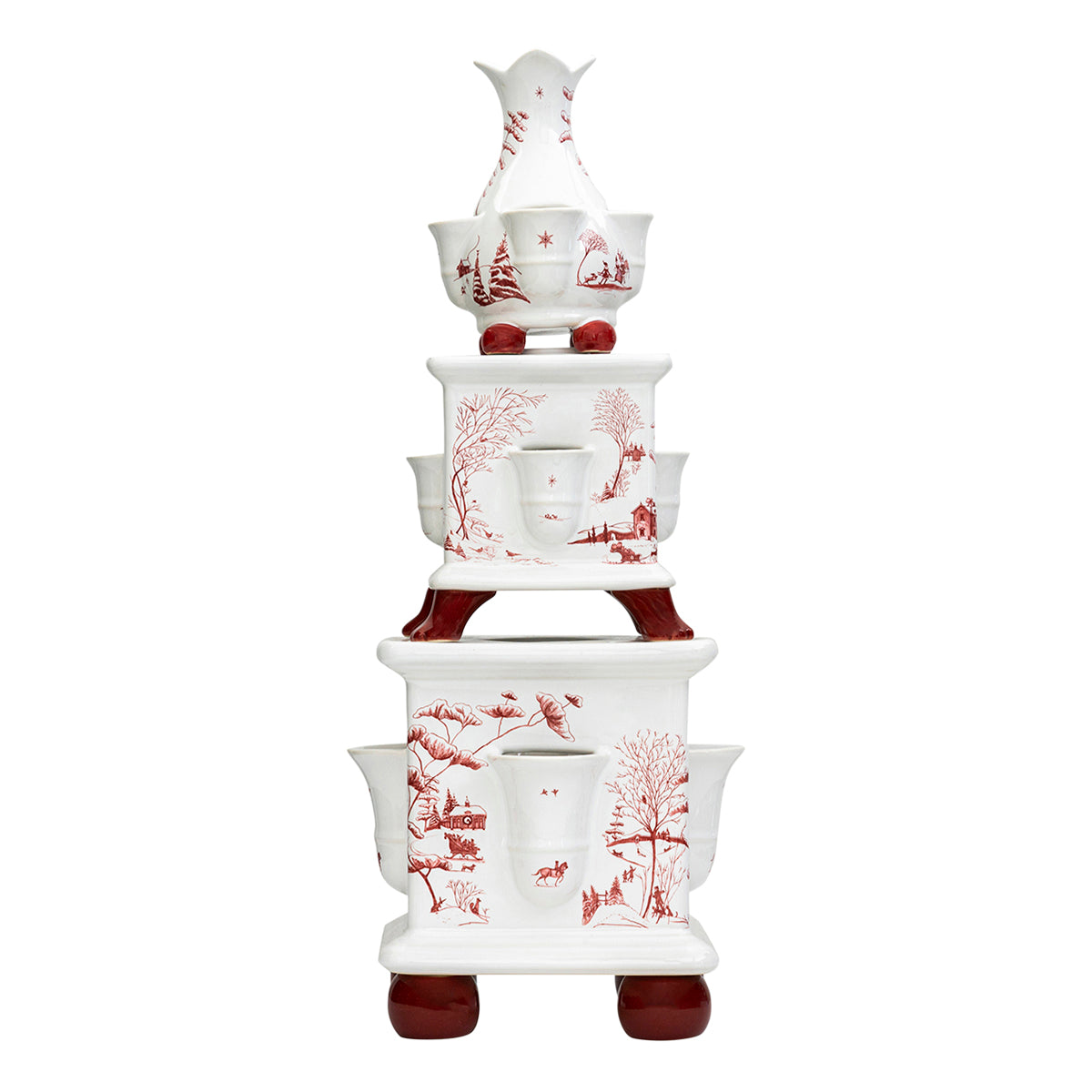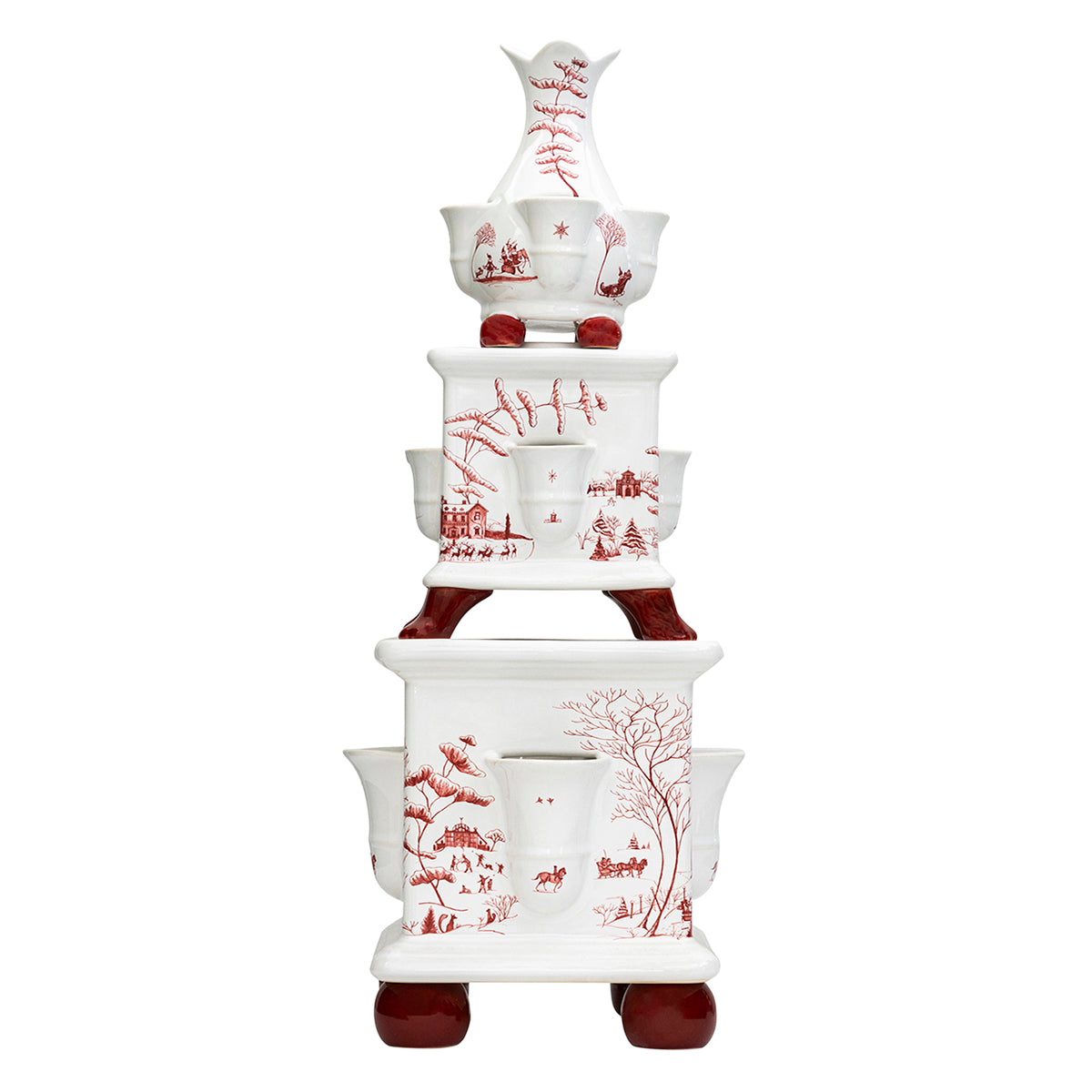 A masterfully crafted, heirloom-worthy Tulipiere is a showstopping work of art for the consummate holiday-decorating enthusiast. Each tier features its own exquisite details - from the intricately painted winter scenes of our beloved Country Estate, down to their sculpted ruby-hued feet. Fill each vase with flowers, greenery, or even mistletoe to set an unforgettable and magical scene.