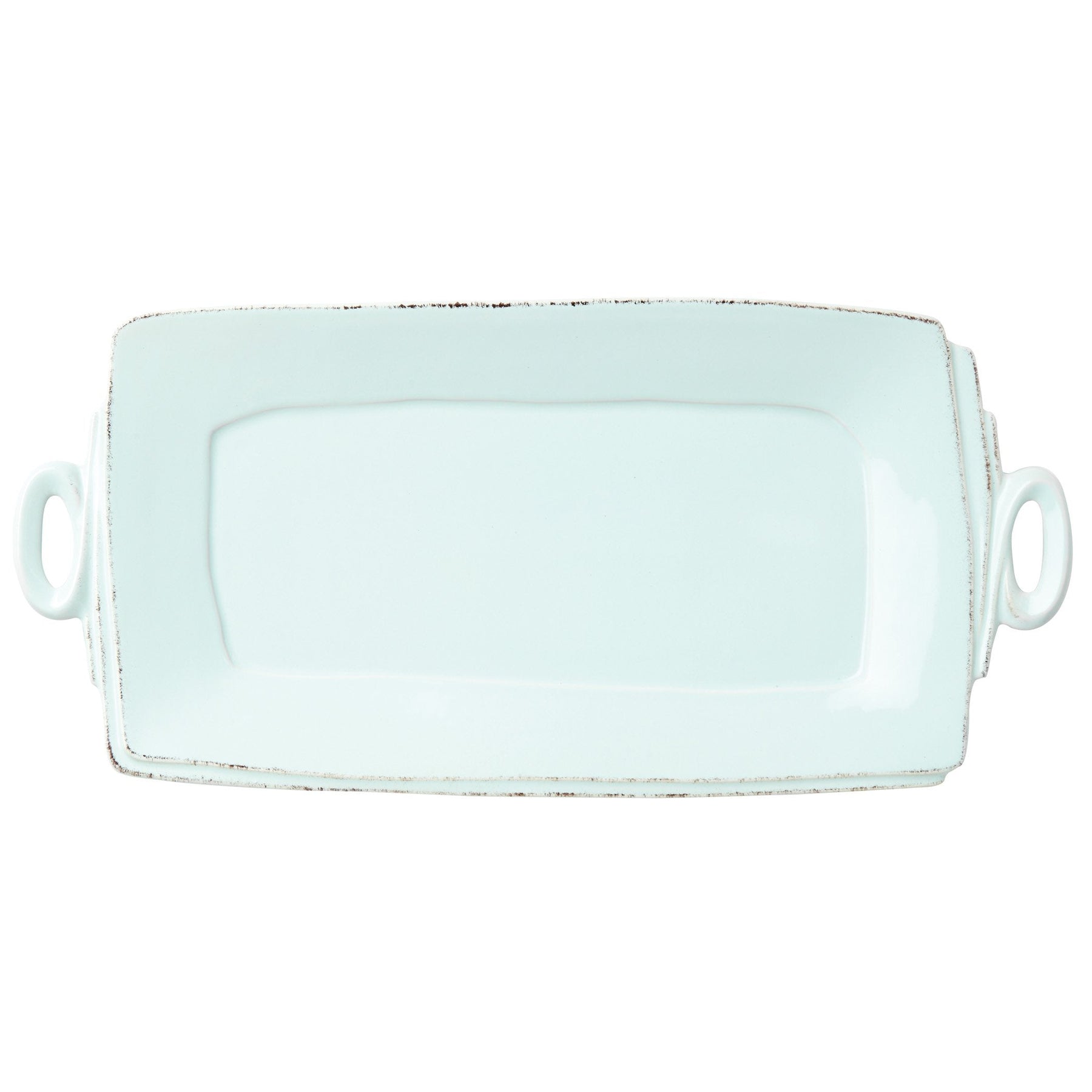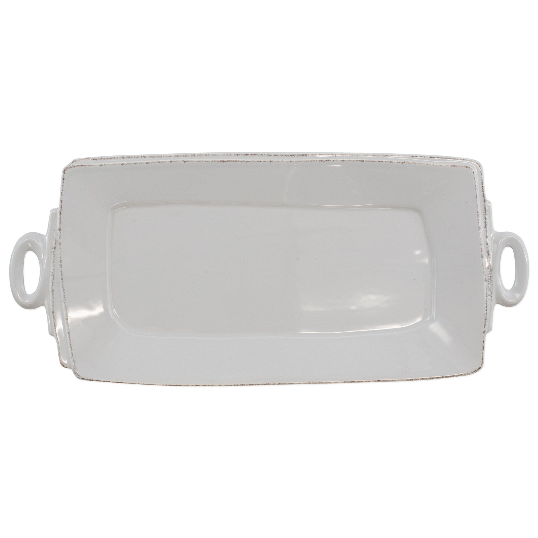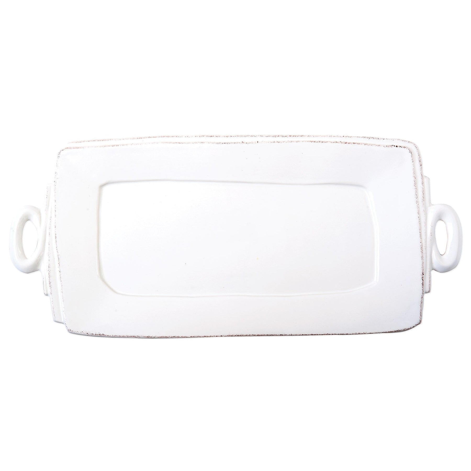 Beloved for its sophisticated simplicity, versatility, and durability, Lastra is our bestselling collection. The understated elegance, clean lines, and unique shape of the Lastra Handled Rectangular Platter make a timeless and elegant serving piece for any table. Lastra’s design was inspired by the circular wooden slabs used for centuries to create the outer mold in cheesemaking throughout Italy. When fashioned together with twine, the hoop was left with a slight overlap to help maintain the shape of the cheese mold. Maestro molder Stefano Roselli incorporates the overlapping detail into the entire design, from its foot to its rim. A dark dusting on the edges of each piece suggests the ash that was used to preserve these cheeses and highlights each unique silhouette.