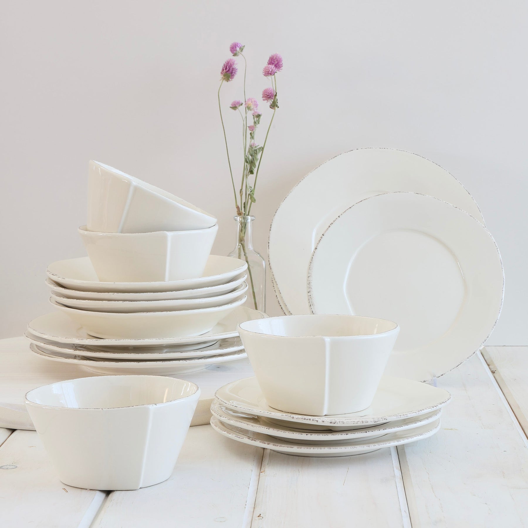 Beloved for its sophisticated simplicity, versatility, and durability, Lastra is our bestselling collection. The Lastra Four-Piece Place Setting is wonderful starter kit for a Lastra collection, and it includes 4 European Dinner Plates, 4 Salad Plates, 4 Pasta Bowls, and 4 Cereal Bowls. Lastra’s design was inspired by the circular wooden slabs used for centuries to create the outer mold in cheesemaking throughout Italy. When fashioned together with twine, the hoop was left with a slight overlap to help maintain the shape of the cheese mold. Maestro molder Stefano Roselli incorporates the overlapping detail into the entire design, from its foot to its rim. A dark dusting on the edges of each piece suggests the ash that was used to preserve these cheeses and highlights each unique silhouette.