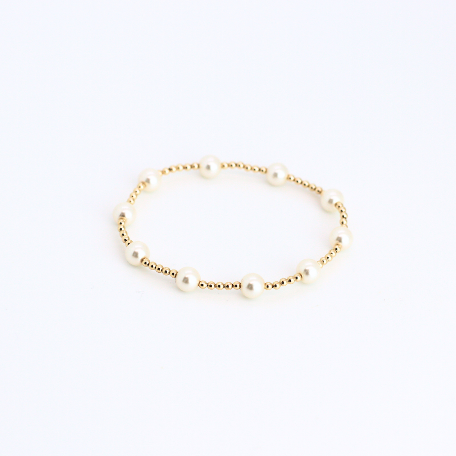 Our Classic patterned go-to bracelet made with 2mm, 14kt gold-filled beads, and 6mm pearls. Made for everyday living, which means sleep, shower and sweat in it. Hand beaded in the USA on high performance elastic for a slight stretch to easily roll on and off your wrist.