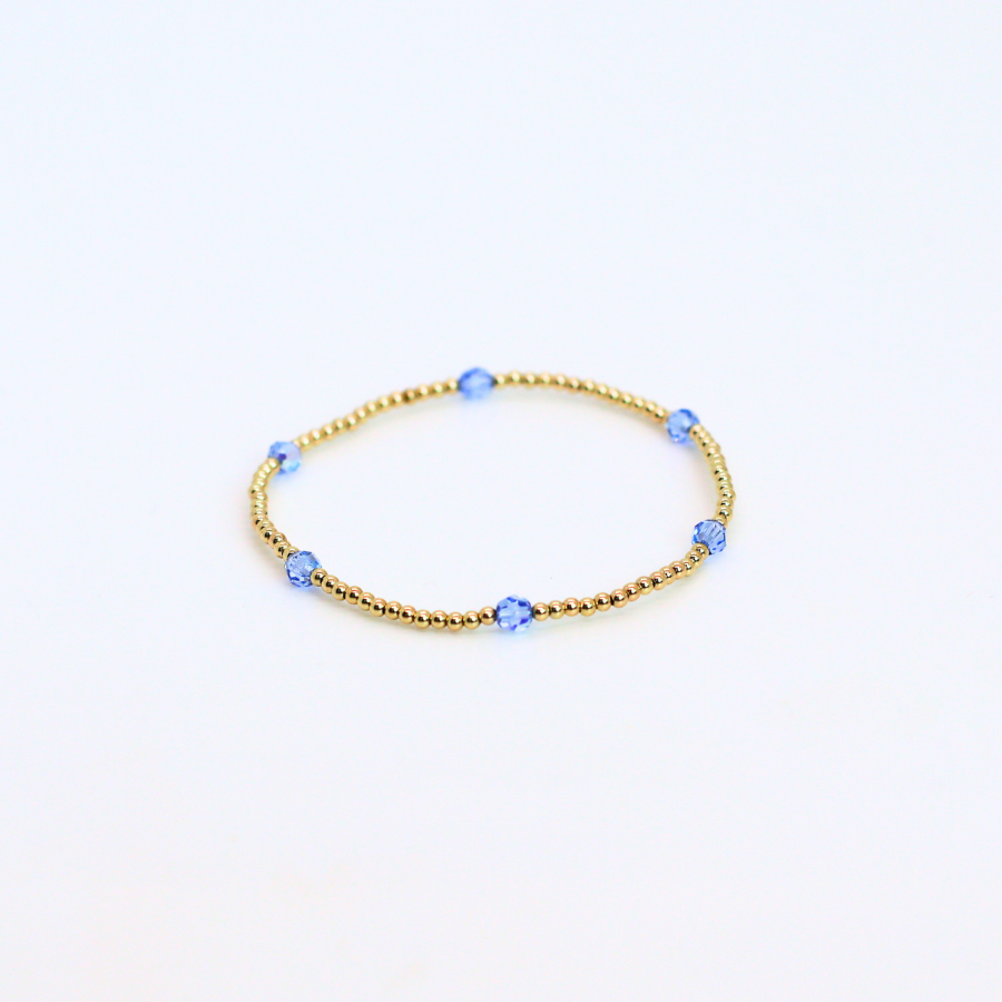 Our Classic patterned go-to bracelet made with 3mm, 14kt gold-filled beads, and 4mm sky blue swarovski crystals. Made for everyday living, which means sleep, shower and sweat in it. Hand beaded in the USA on high performance elastic for a slight stretch to easily roll on and off your wrist.