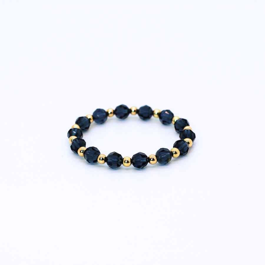Our Classic patterned go-to bracelet made with 6mm, 14kt gold-filled beads, and 8mm denim blue swarovski crystals. Made for everyday living, which means sleep, shower and sweat in it. Hand beaded in the USA on high performance elastic for a slight stretch to easily roll on and off your wrist.