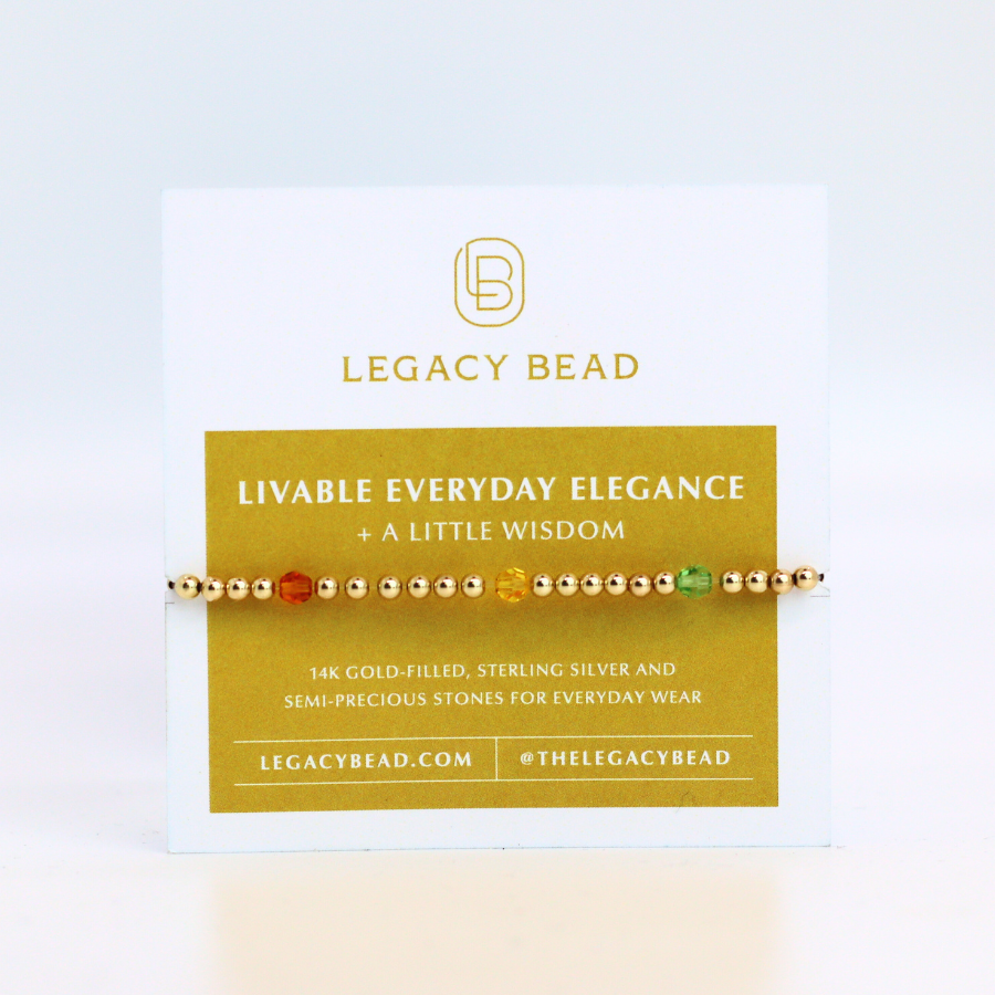 Bracelet is made with 3mm 14kt gold-filled beads, and 4mm Swarovski crystals. Created for everyday living, which means sleep, shower and sweat in it. Hand beaded in the USA on high performance elastic for a slight stretch to easily roll on and off your wrist.