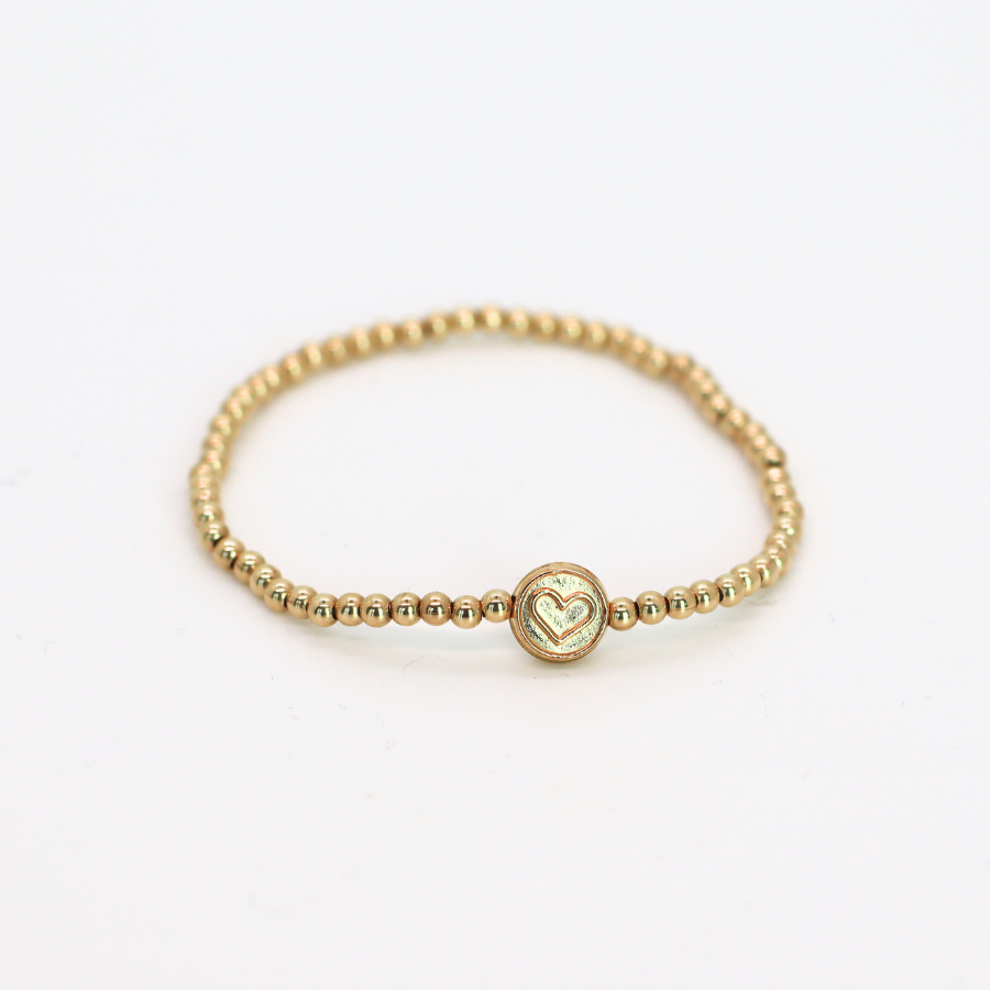 Details • 2mm 14kt gold-filled beads • Gold round heart charm • Standard fit: 6.5" • High-performance stretch elastic • Made for sleep, shower & sweat • A perfect everyday token of love