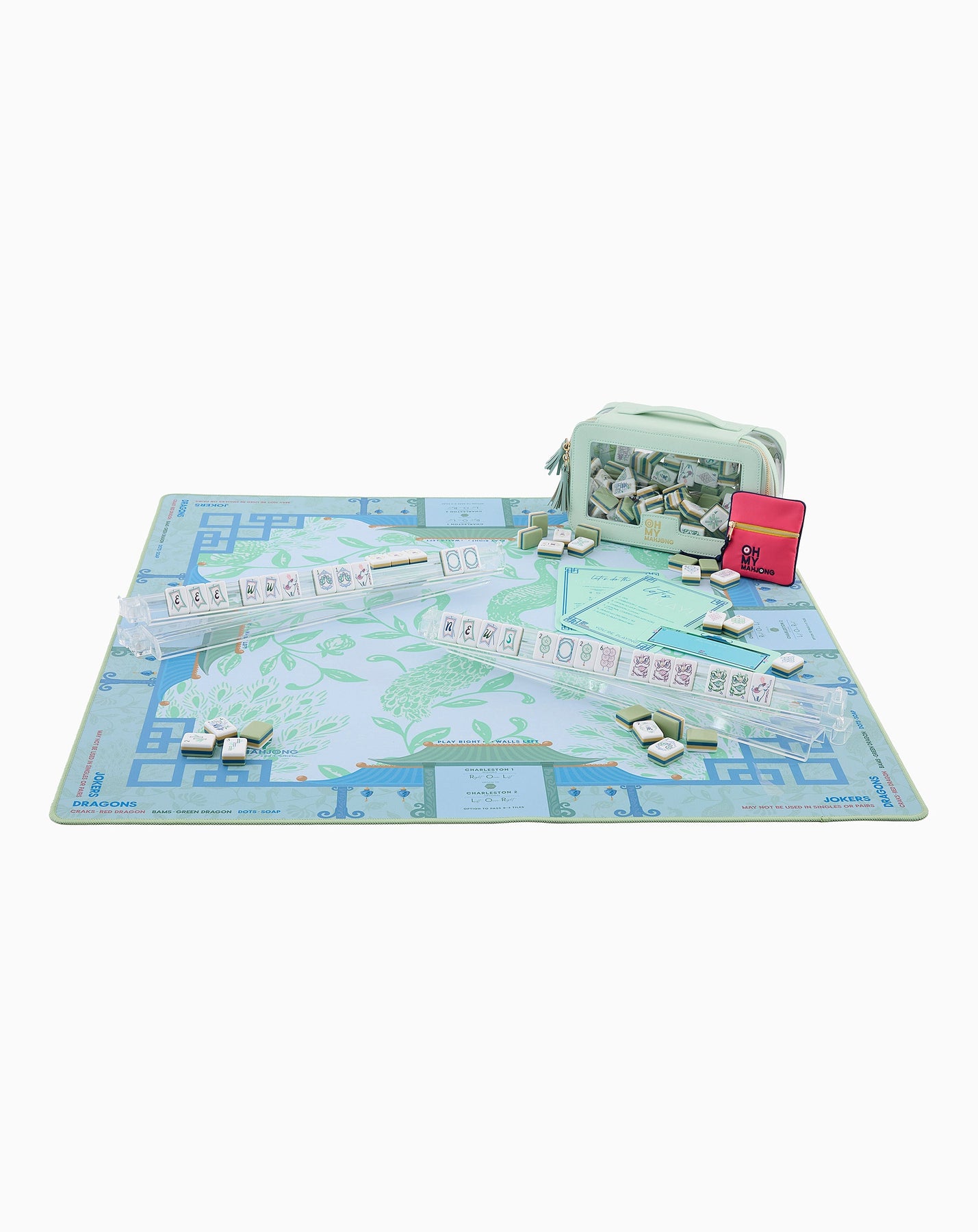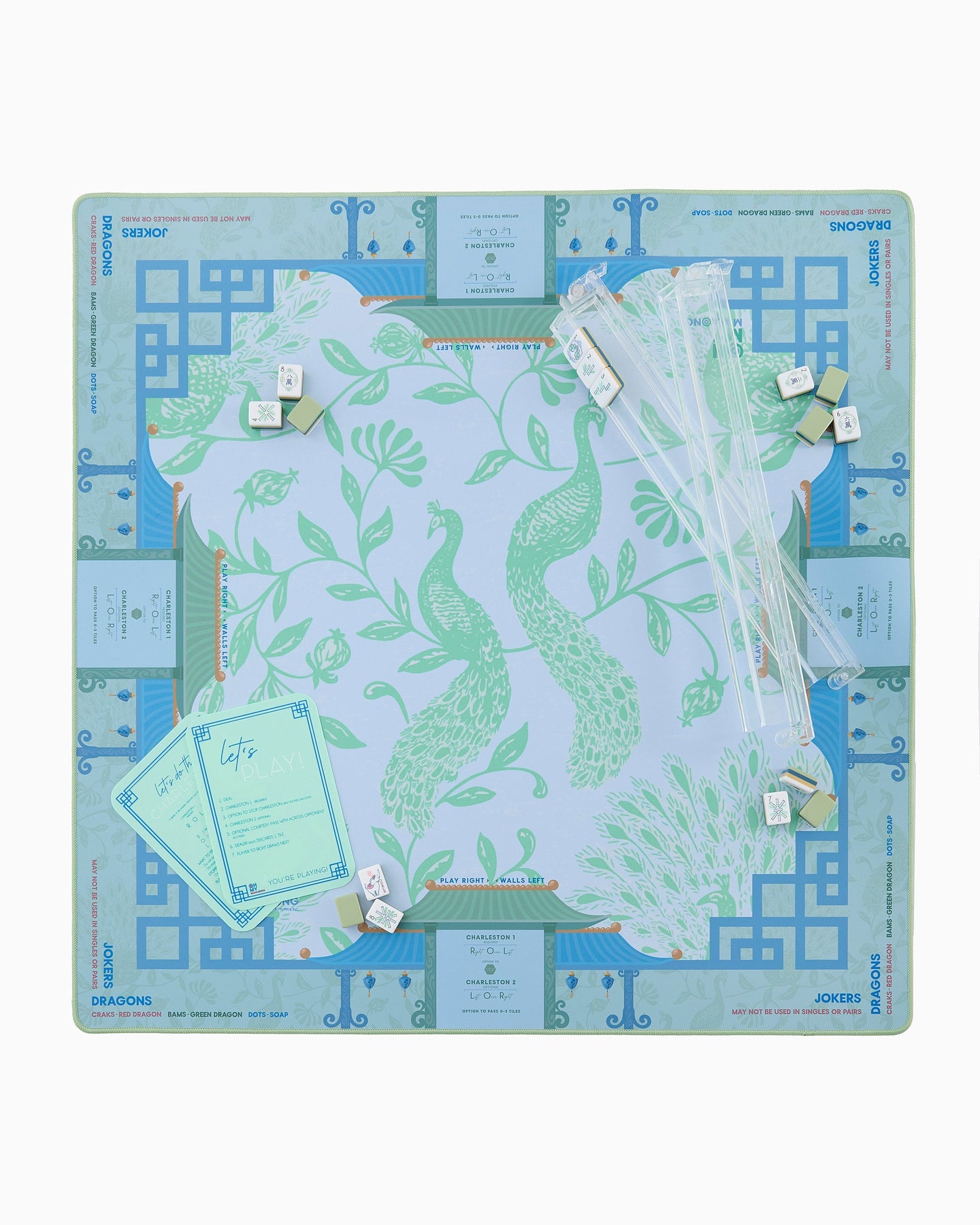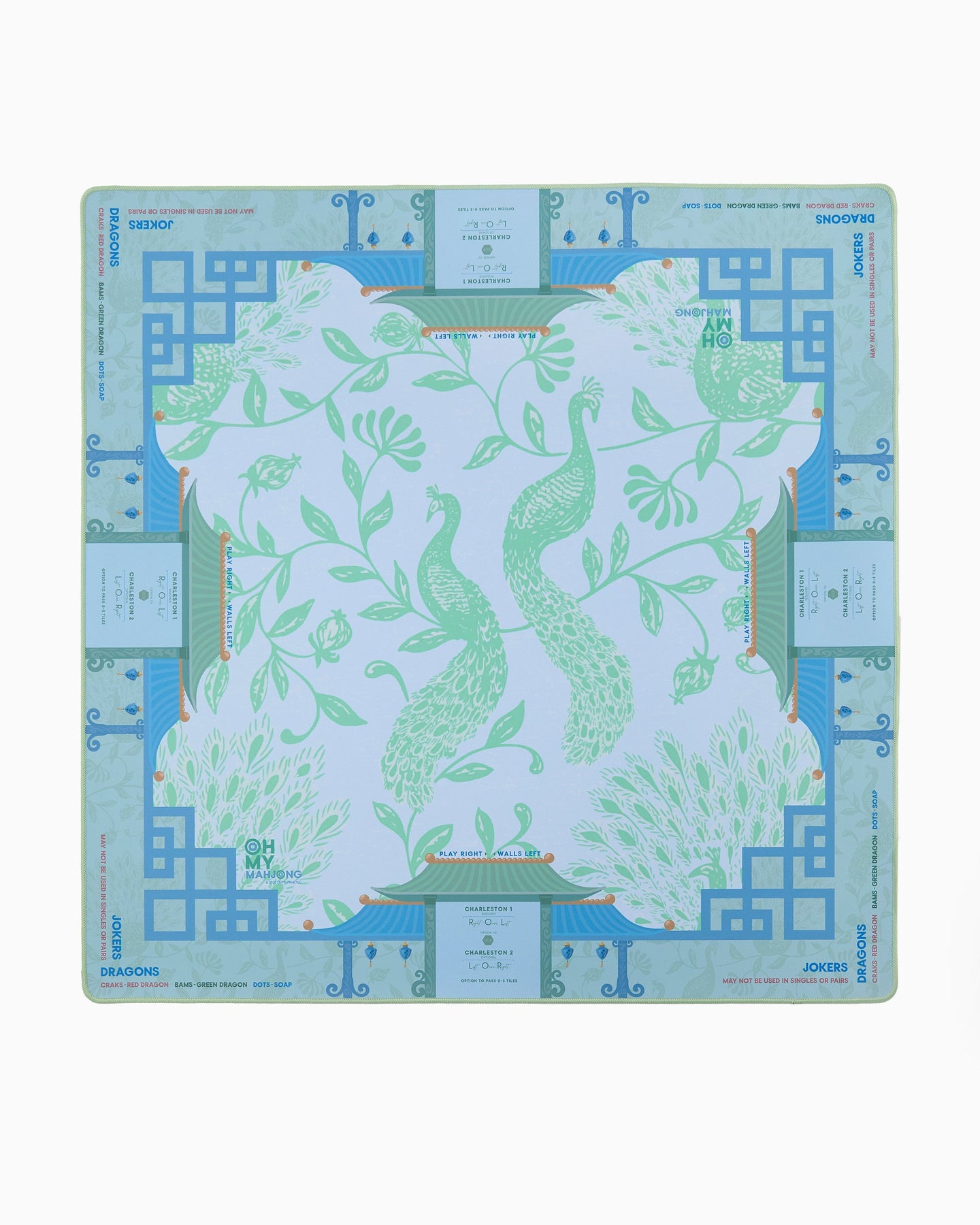 Fresh, airy, and effortlessly serene, the Isla Mahjong Mat brings a light, coastal elegance to your table. Featuring graceful peacock motifs in soft green tones layered against cool blues and delicate architectural details, this design feels calm, balanced, and beautifully refined.
