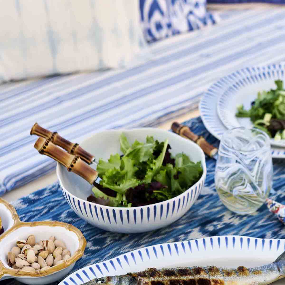 Inspired by the idyllic town of Sitio, Portugal, where the waves crash majestically against the cliffs, comes a fresh and relaxed pattern that puts an artistic exclamation point on everything within its frame of radiating stripes in Delft blue. This set includes a dinner plate, dessert/salad plate, cereal/ice cream bowl and a coupe pasta bowl.