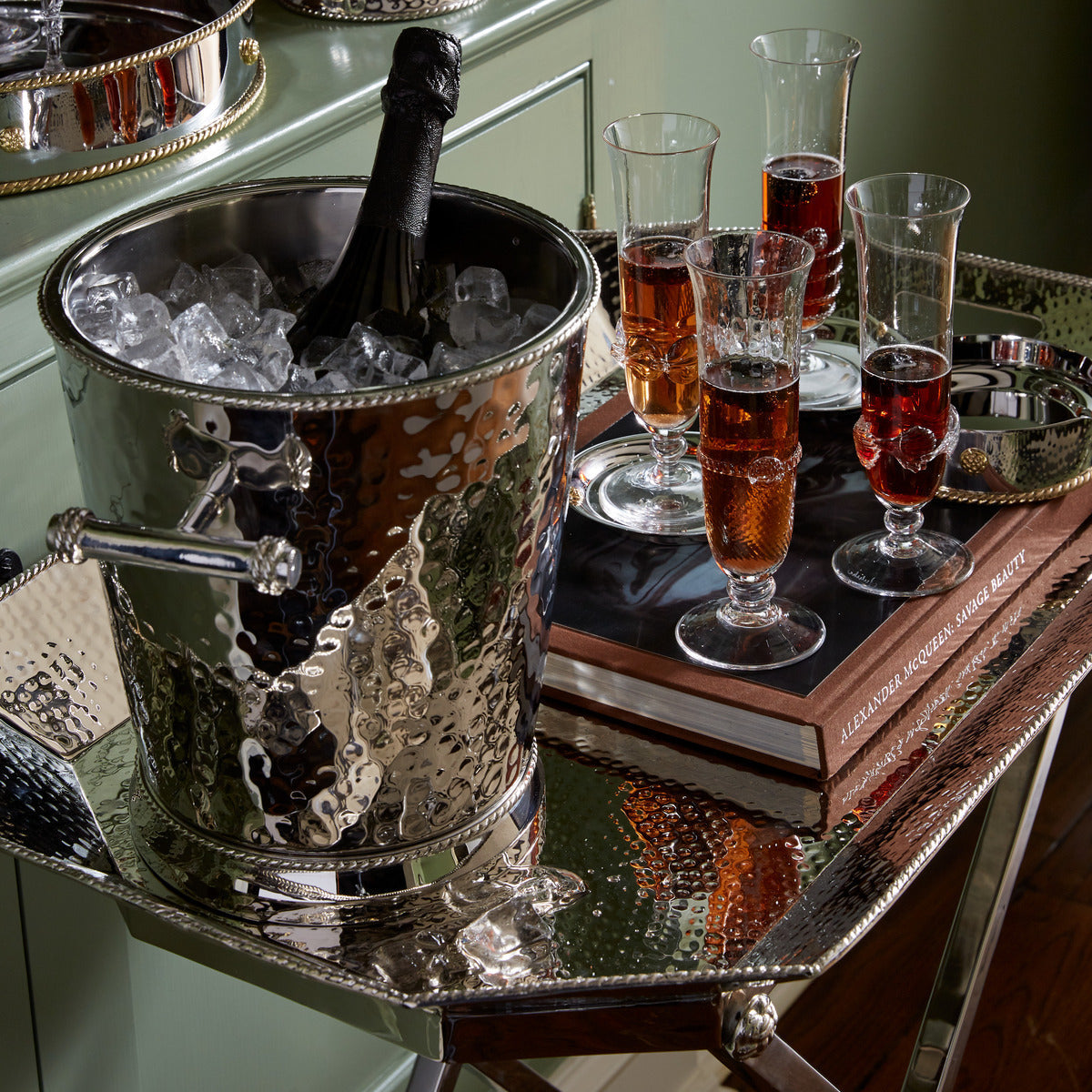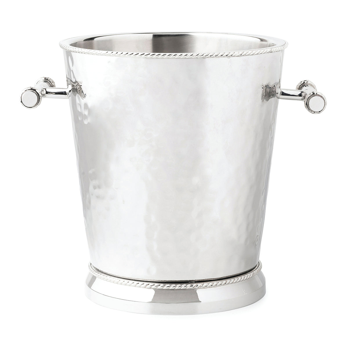 Decorated with a tidy trimming of simple thread, each piece in our Graham barware collection is handmade in hammered stainless steel and polished to brilliance. Featuring two handles, this generously sized wine cooler is double walled to prevent condensation and may be used to chill bottles of wine, champagne, or as an extra-large ice bucket.