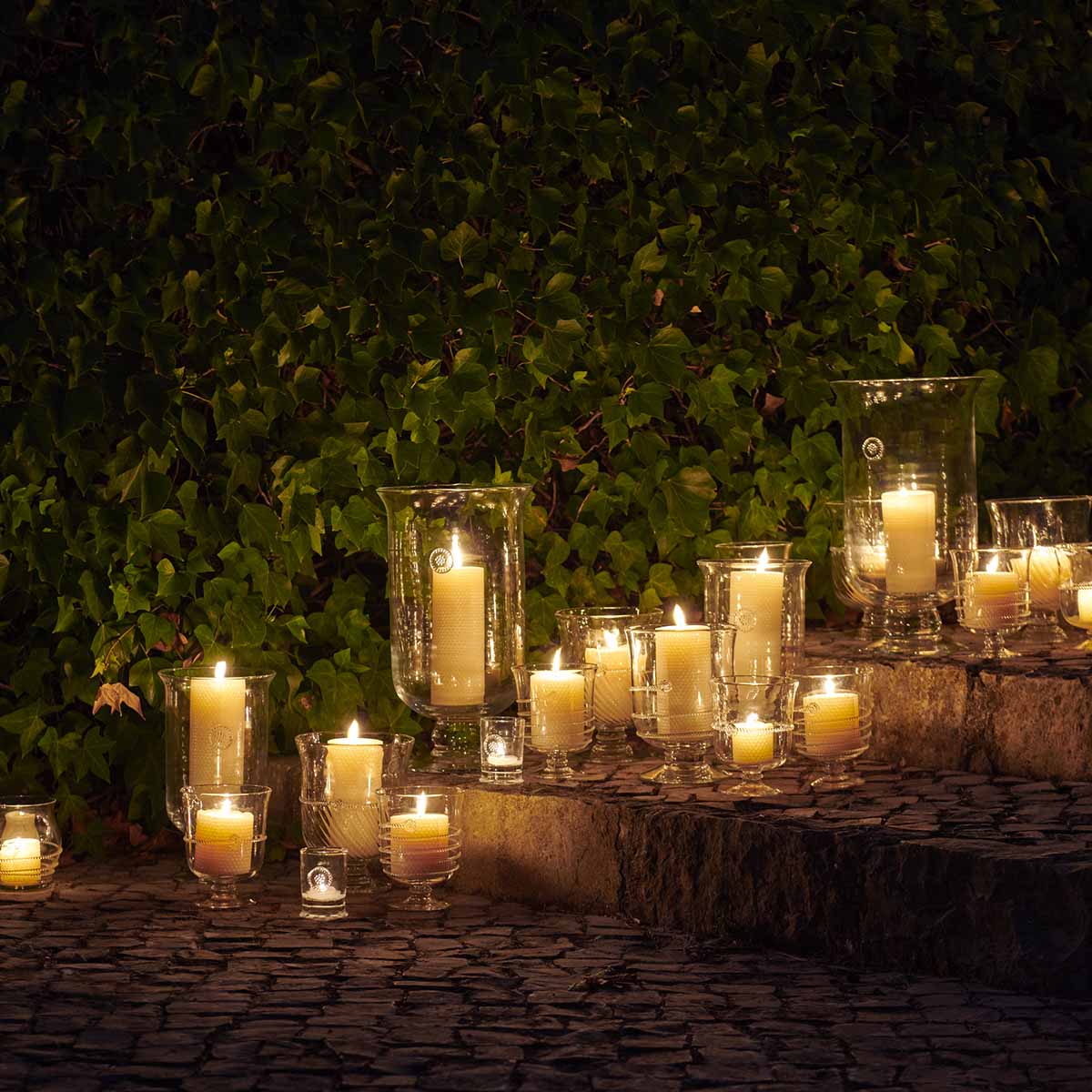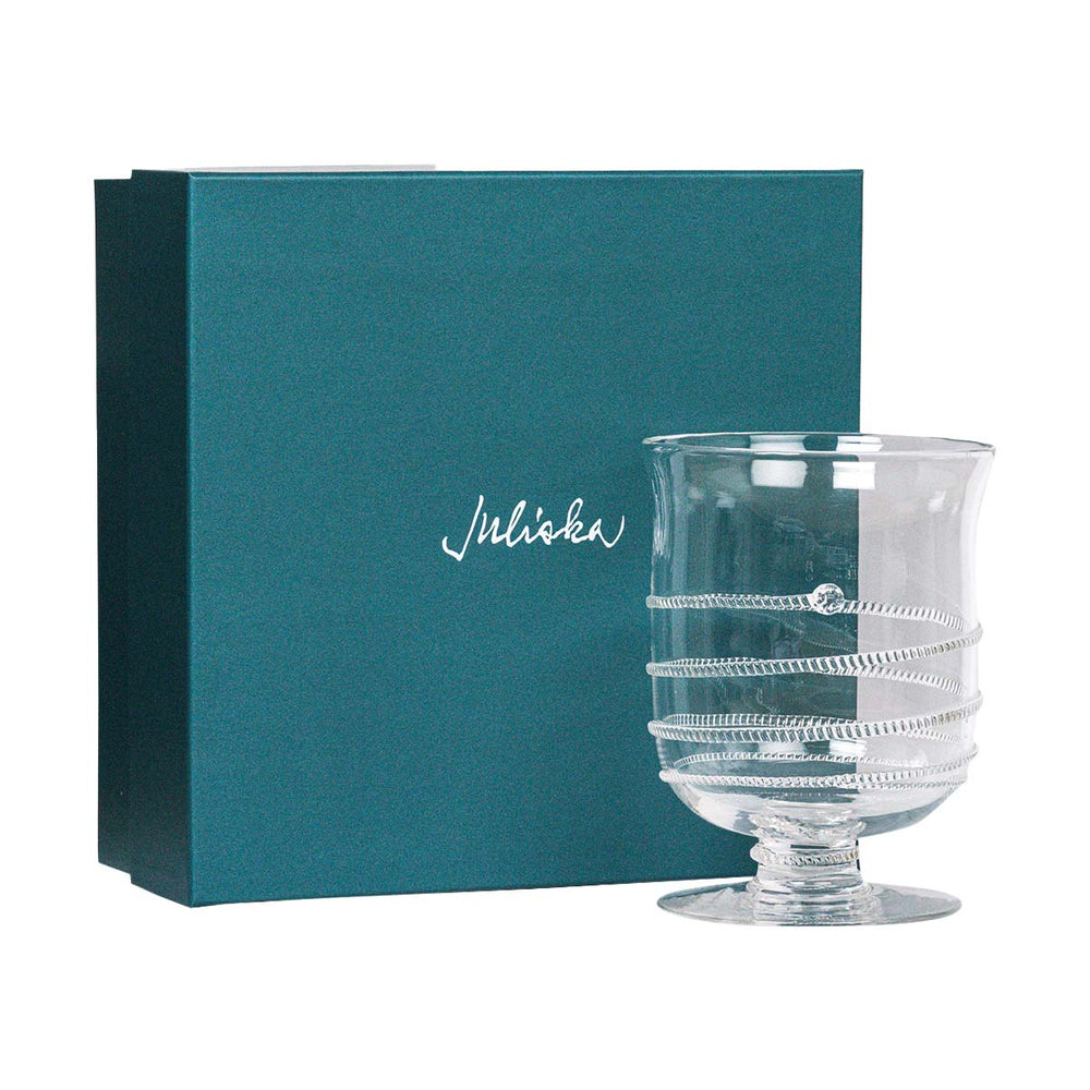 Flickering candlelight is taken to new heights with this exquisite hurricane that is festooned with the uplifting swirl of our iconic glass thread and single berry that never fails to enhance the magical twinkle and romance of any setting. Made of expertly mouth-blown glass with intricate details that only a master glass artist can produce, this versatile vessel is also fantastic for floral arrangements and makes a fabulous gift.