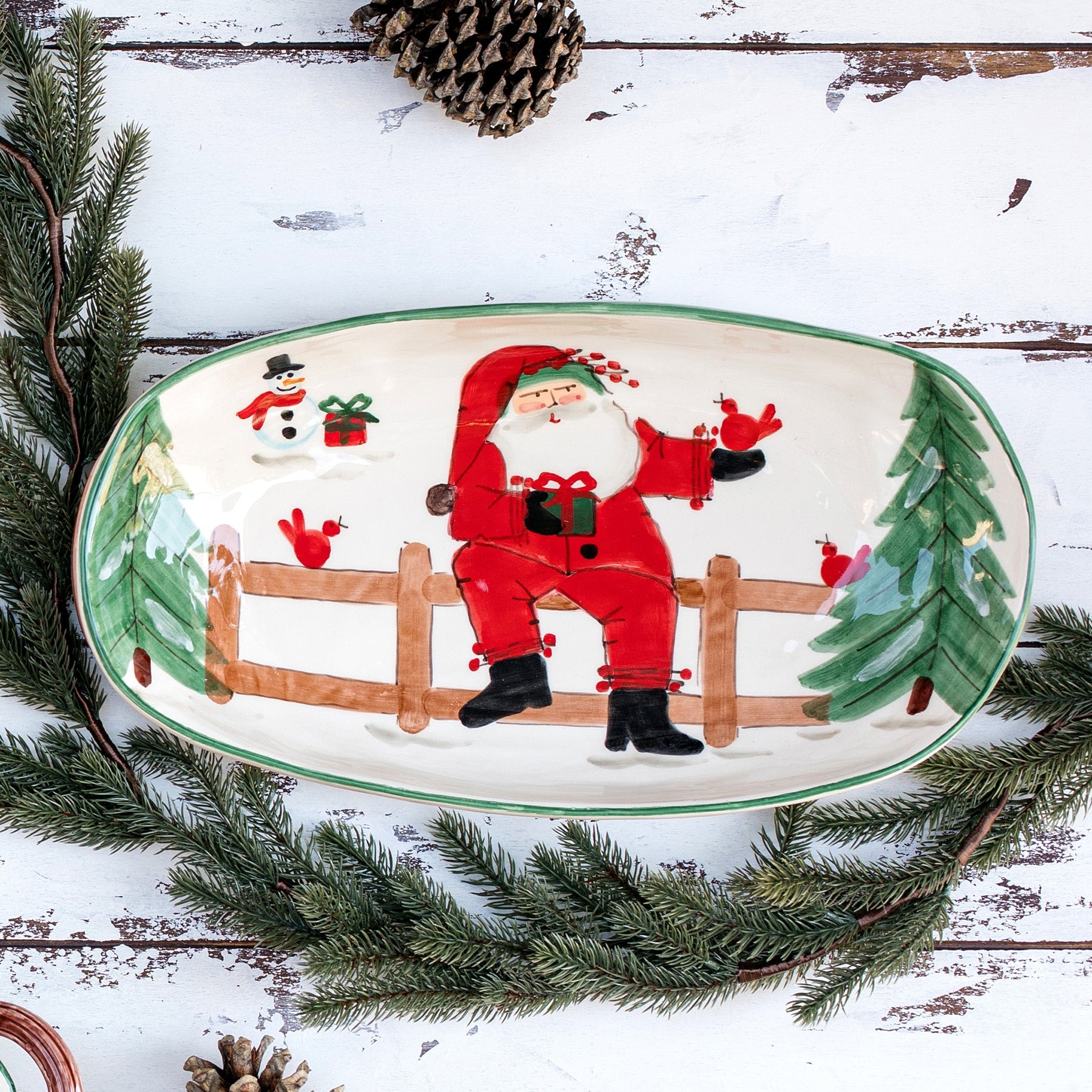 VIETRI’s signature holiday collection is created from maestro artisan Alessandro Taddei’s childhood memories of stories his mother used to read to him about Babbo Natale, Italy’s Santa Claus. Alessandro relays his favorite scenes from those stories through his whimsical designs on the Old St. Nick Shallow Oval Bowl.