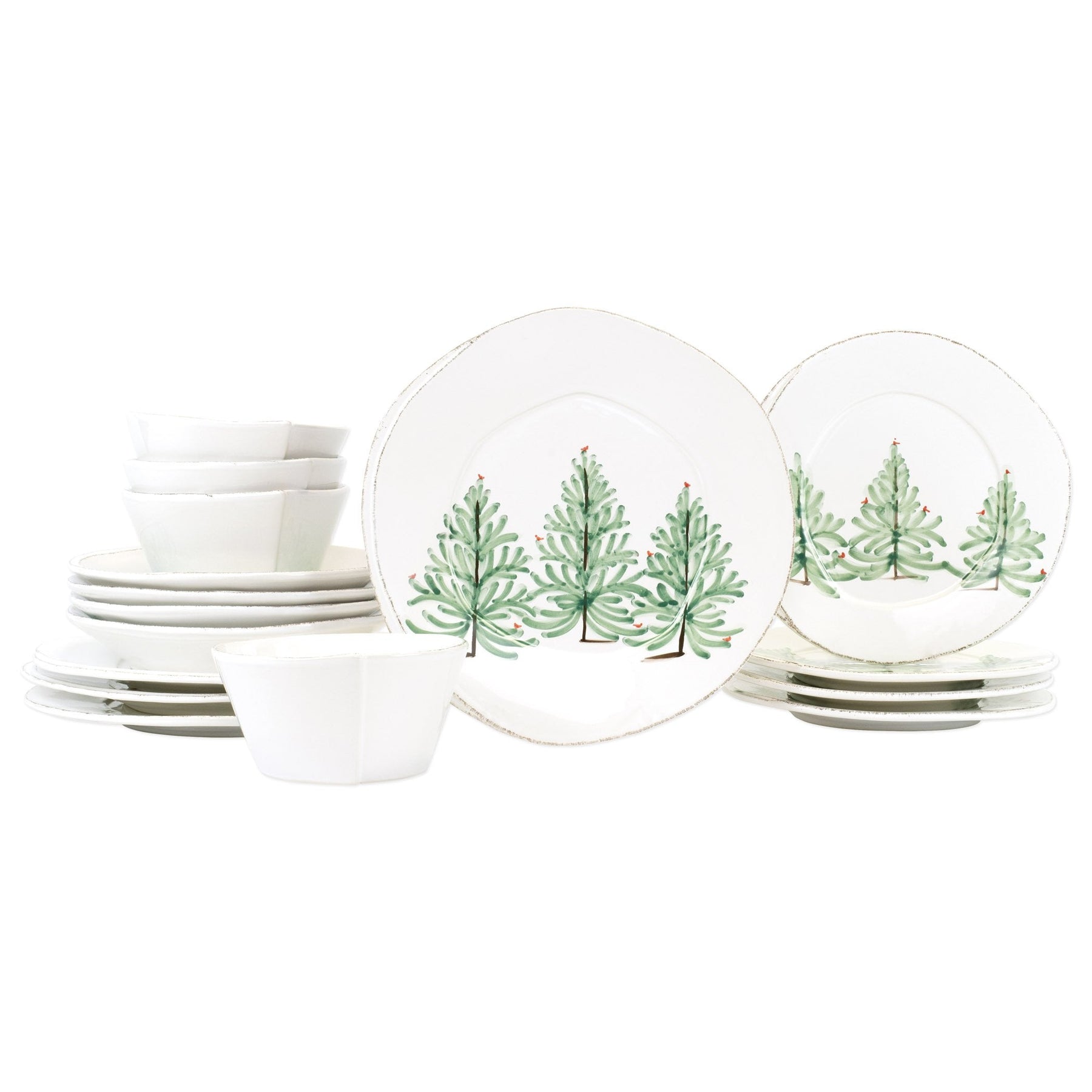 Delight in the holiday magic as handpainted fir trees and bright cardinals drift across the fresh white canvas of each handcrafted piece in the Lastra Holiday Sixteen-Piece Place Setting. This cheerful set is handpainted on Italian stoneware in Tuscany and includes 4 European dinner plates, 4 salad plates, 4 pasta bowls, and 4 cereal bowls.