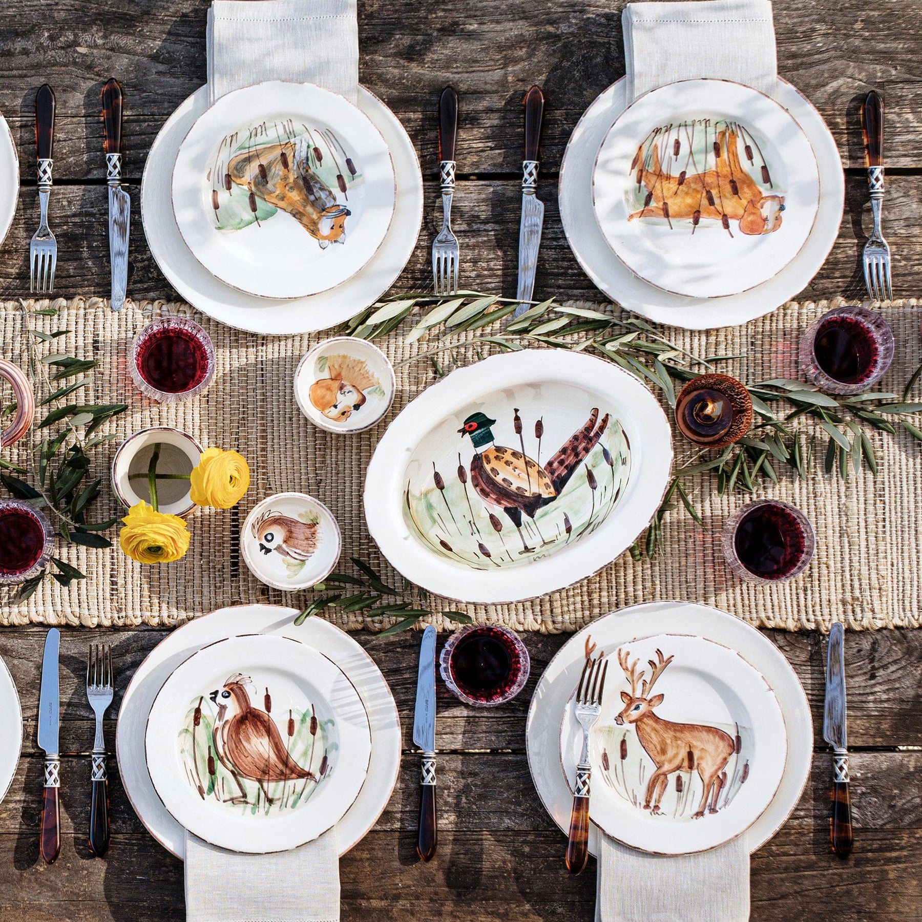 The Wildlife Pheasant Small Rimmed Oval Bowl brings the vibrant charm of the outdoors to your table with exquisite handpainted details. Crafted by Italian artisans, this bowl features a beautifully depicted pheasant, symbolizing the richness of nature and the grace of wildlife. Perfect for serving small dishes or as an elegant accent, it adds a rustic yet refined touch to any setting.