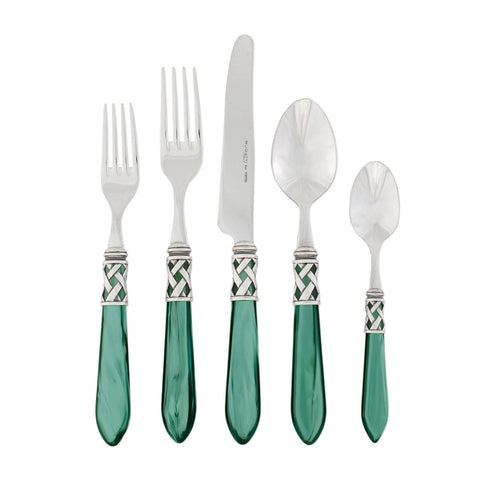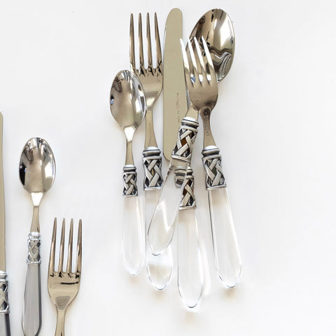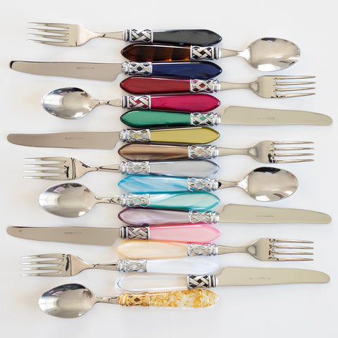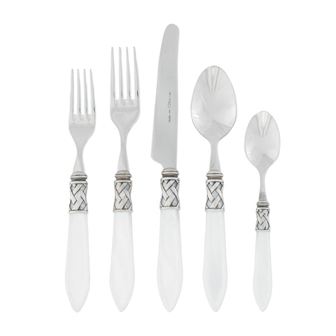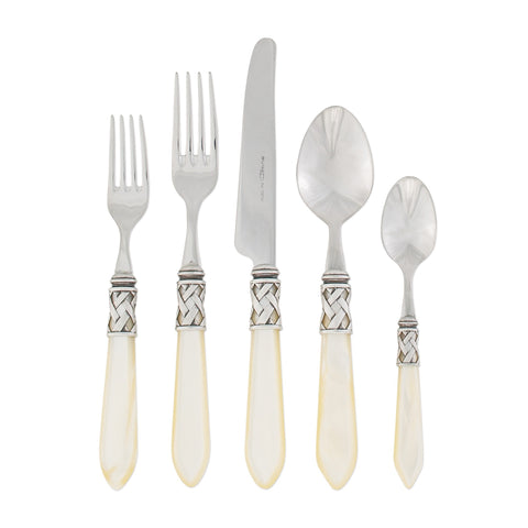 The Aladdin Antique Five-Piece Place Setting features elegant pearlized handles with the strength of high-grade acrylic and 18/10 stainless steel. The handles are wrapped with intricate lattice metalwork.