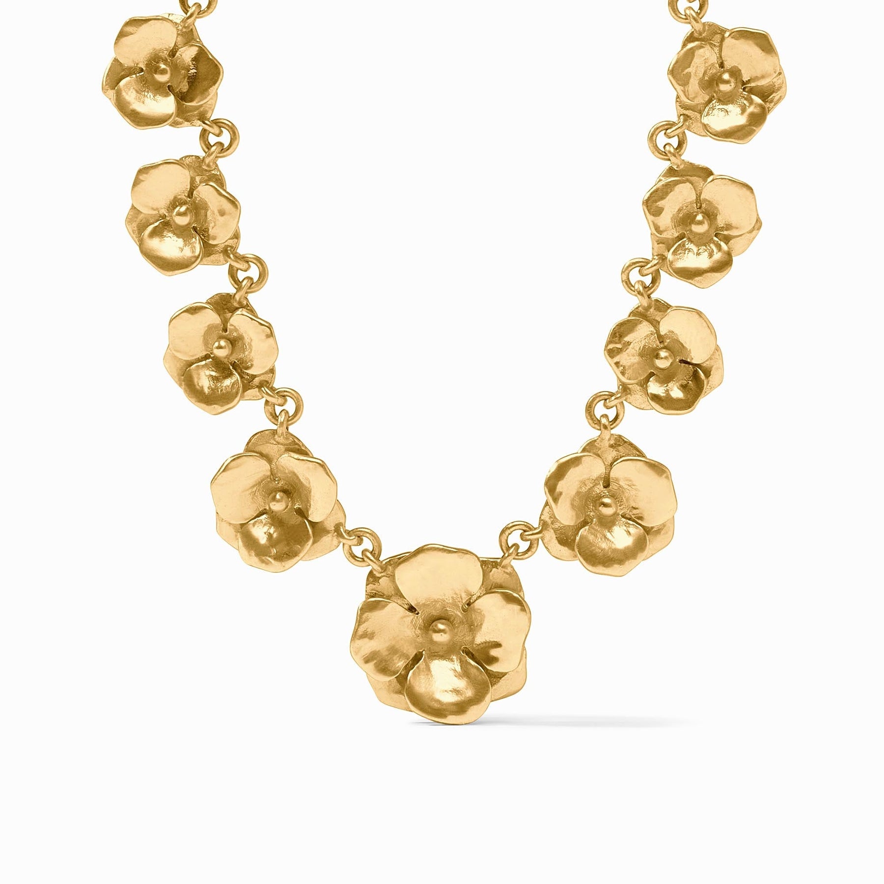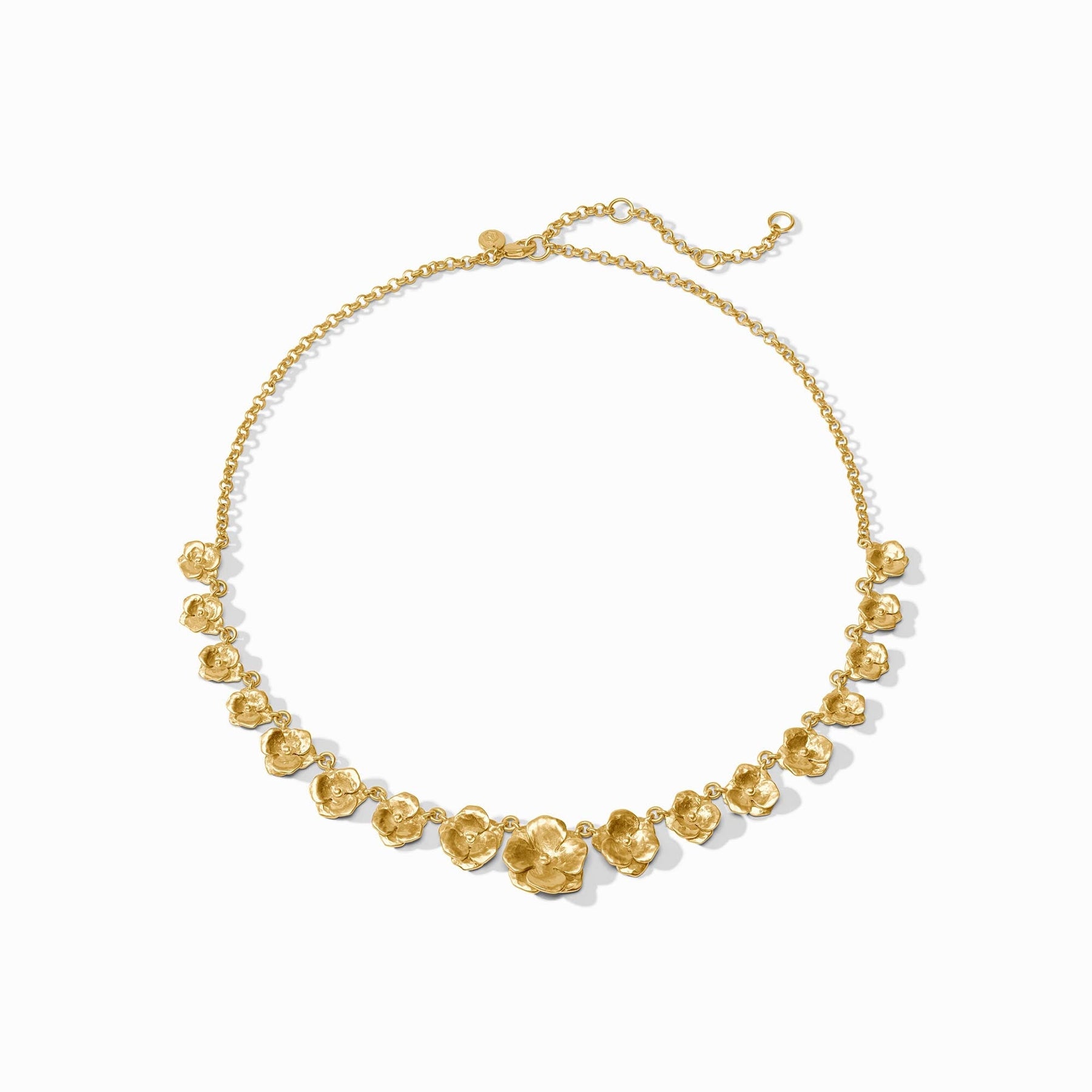 An opulent necklace of sculpted golden blossoms, suspended from an adjustable rolo chain.