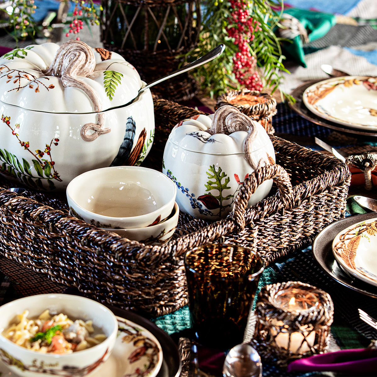 With a creamy café au lait background and artistic scattering of our Forest Walk motif, these lidded pumpkins capture the rich natural beauty of the season. Fill with everything from soups and sides to festive candies or found acorns to display. Our favorite detail? That gorgeously curling tendril of a stem on top.