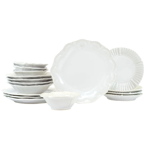 Italian for enchantment, Incanto is inspired by Italy's art, landscape, and Venetian history. The soft ripples of the Adriatic Sea, the columns of the Palladian villas along the Brenta River, the beautiful lace of Venice’s Burano Island, and 17th century baroque architecture are reimagined in the dinnerware’s design, and the result is a captivating collection made to be mixed and matched. The Incanto Assorted Sixteen-Piece Place Setting includes four assorted European dinner plates, four assorted salad plates, four assorted pasta bowls, and four assorted cereal bowls.