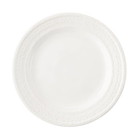 This sophisticated 4 piece place setting in whitewash was inspired by the French basket weave often found in equestrian and nautical traditions. Contains a dinner plate, dessert/salad plate, cereal/ice cream bowl and coupe pasta/soup bowl.